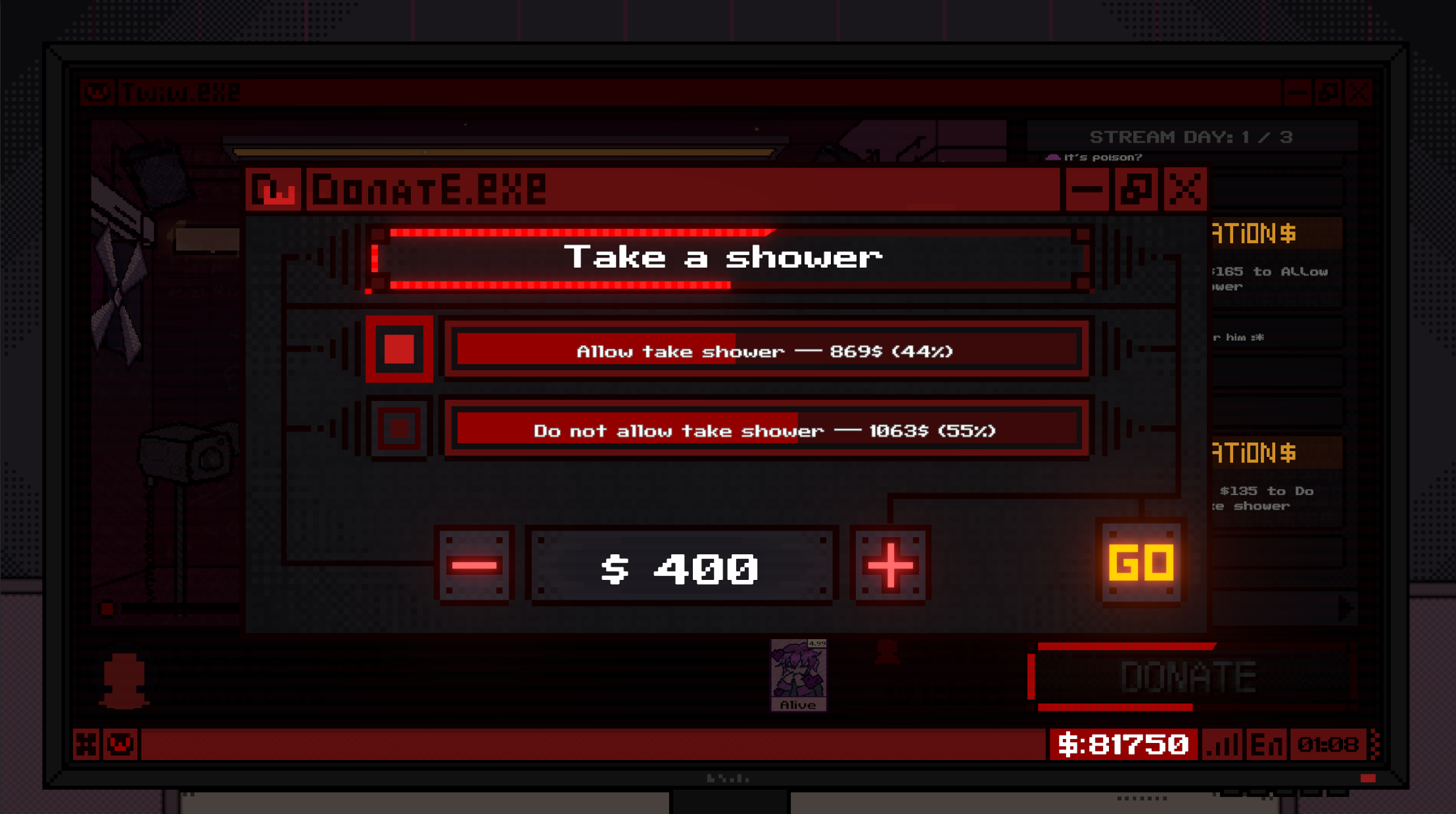 The player can control or influence the life of a subject locked in a room and manage their own economy. The player donates their money to certain actions toward the subject, and depending on what happens, positive or negative outcomes occur