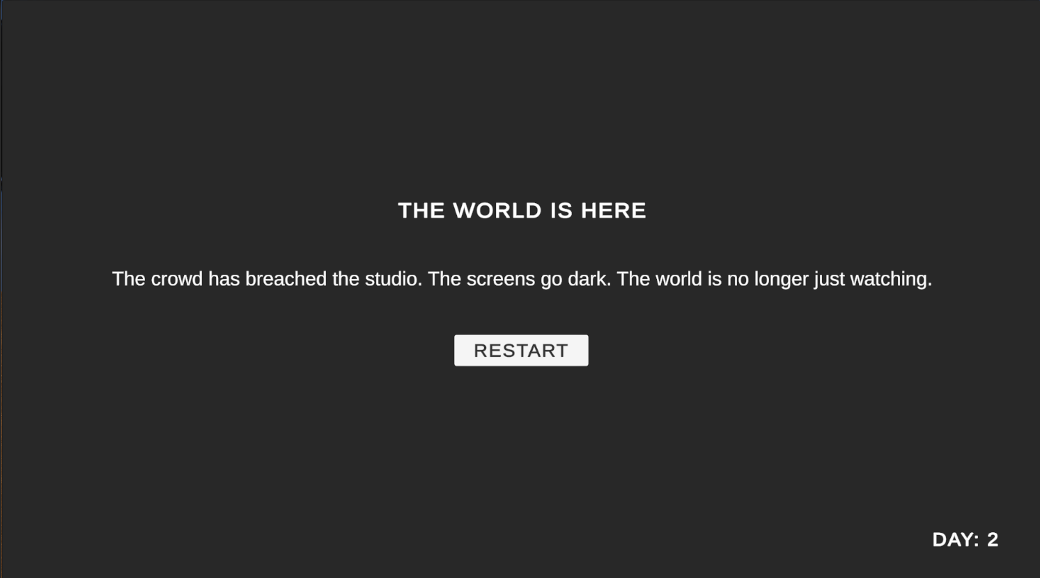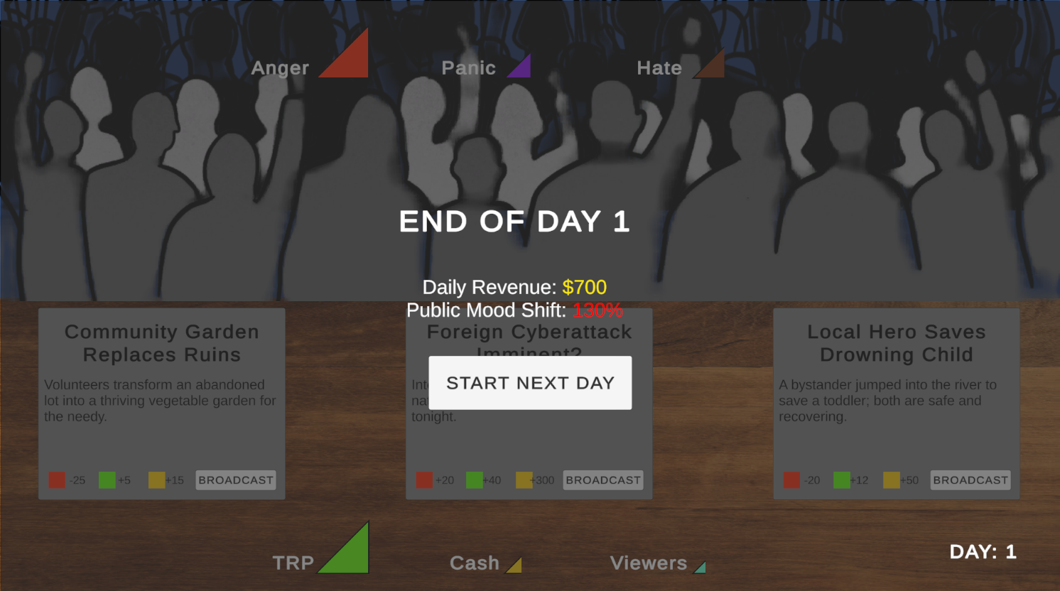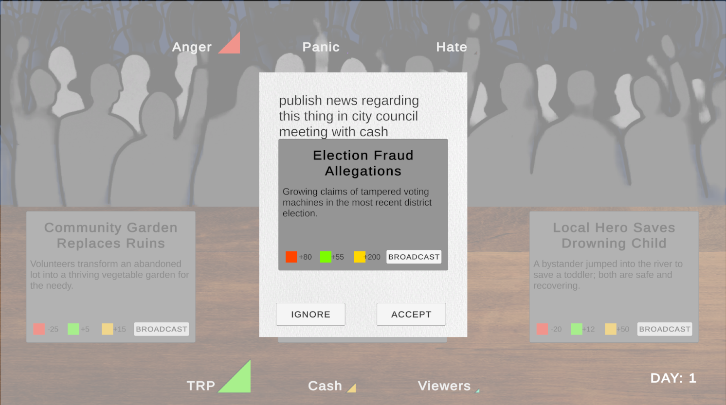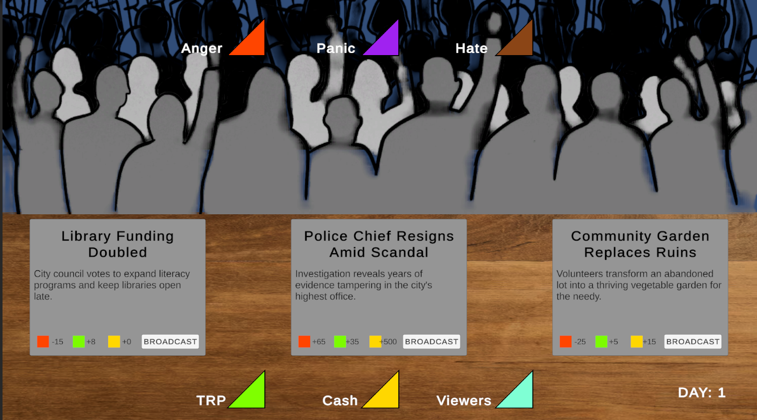 You run a news studio and you will be required to make a decision whether to broadcast a certain news or not based on the current Anger, Panic and Hate levels of the general public. But the player has to be careful not to cause a riot among the public.