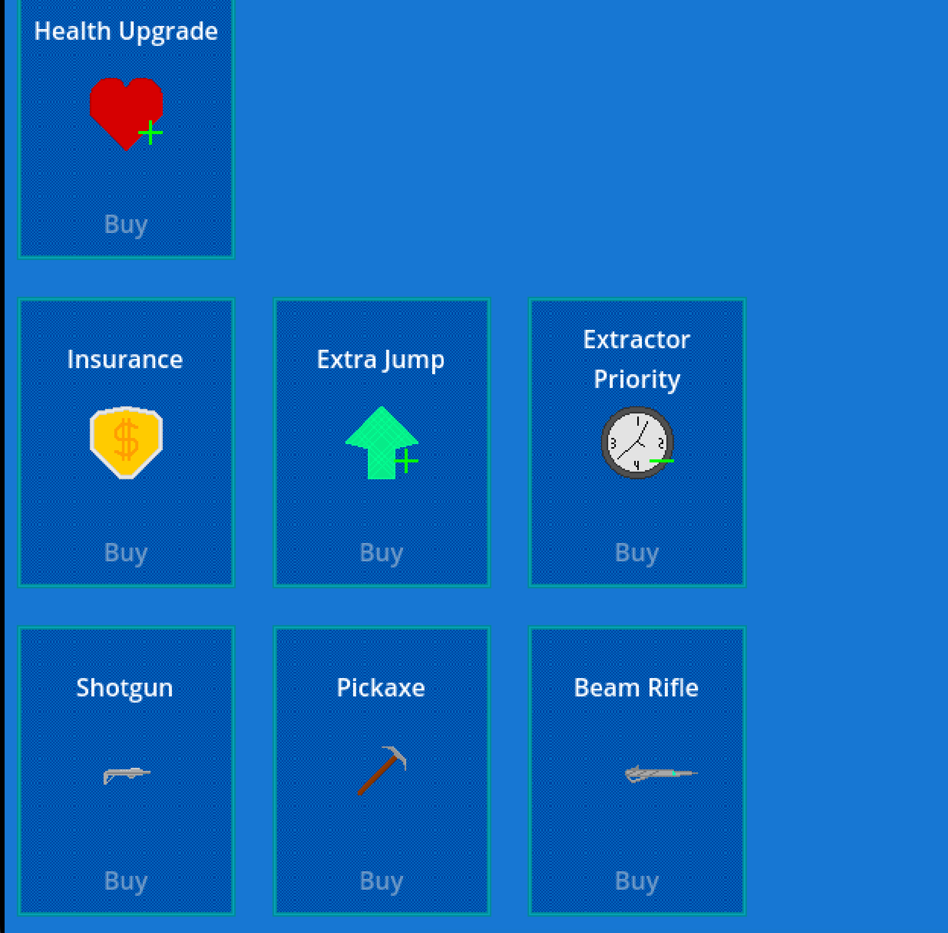 Ambitious concept. Well done. I unfortunately got soft locked because I was saving money for a pick axe and didn't spend anything on extra jump and went in a cave I couldn't jump out of. The leveling system is cool.
