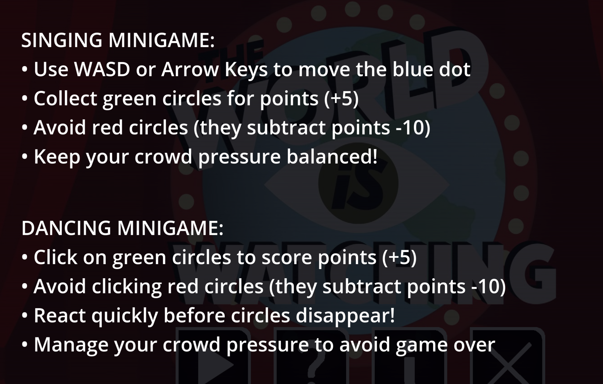 Simple to understand quick mini-games. One of them reminded me of Osu but you're just a little guy. WASD did not work during the singing game but arrow keys did.