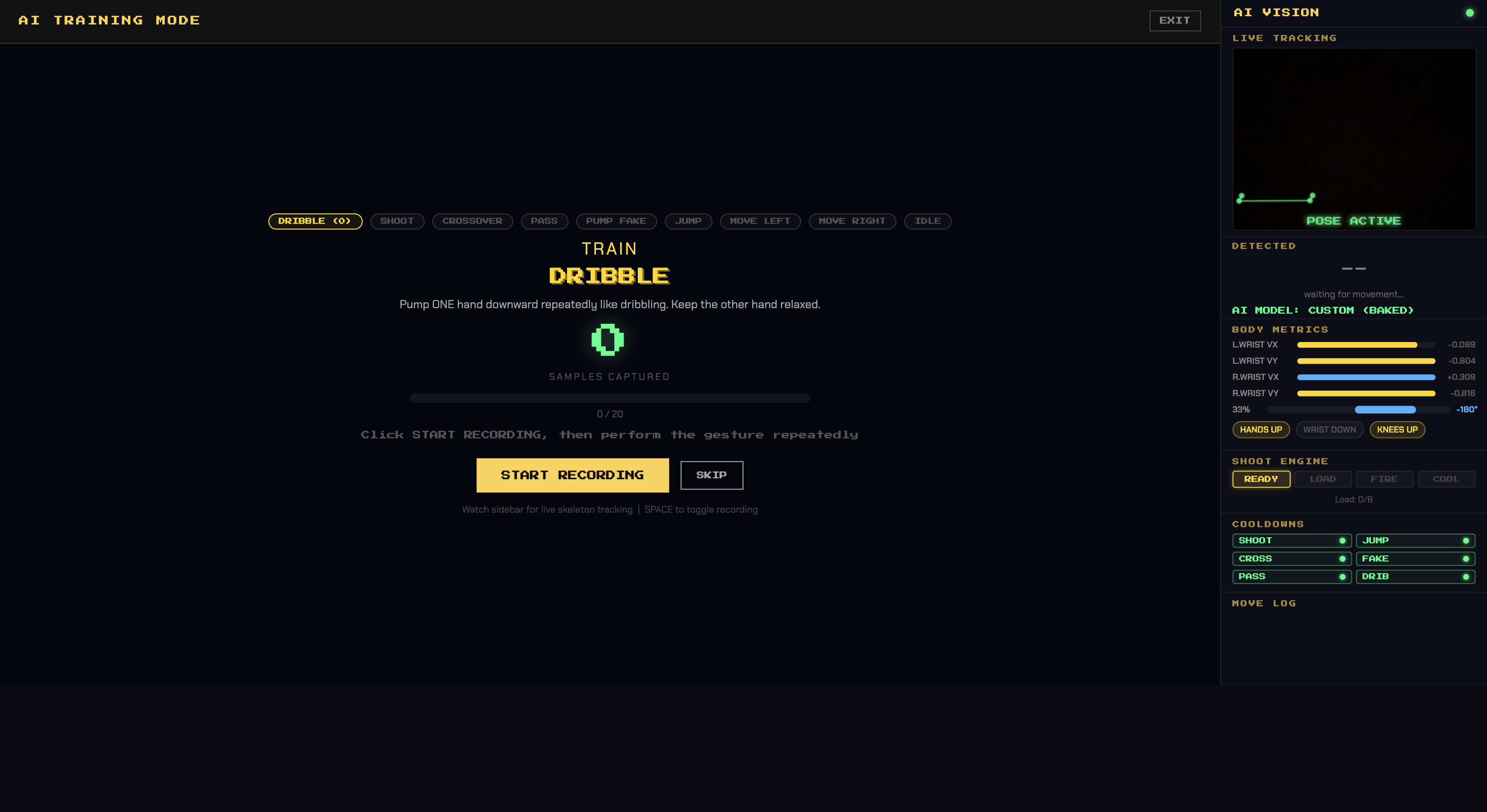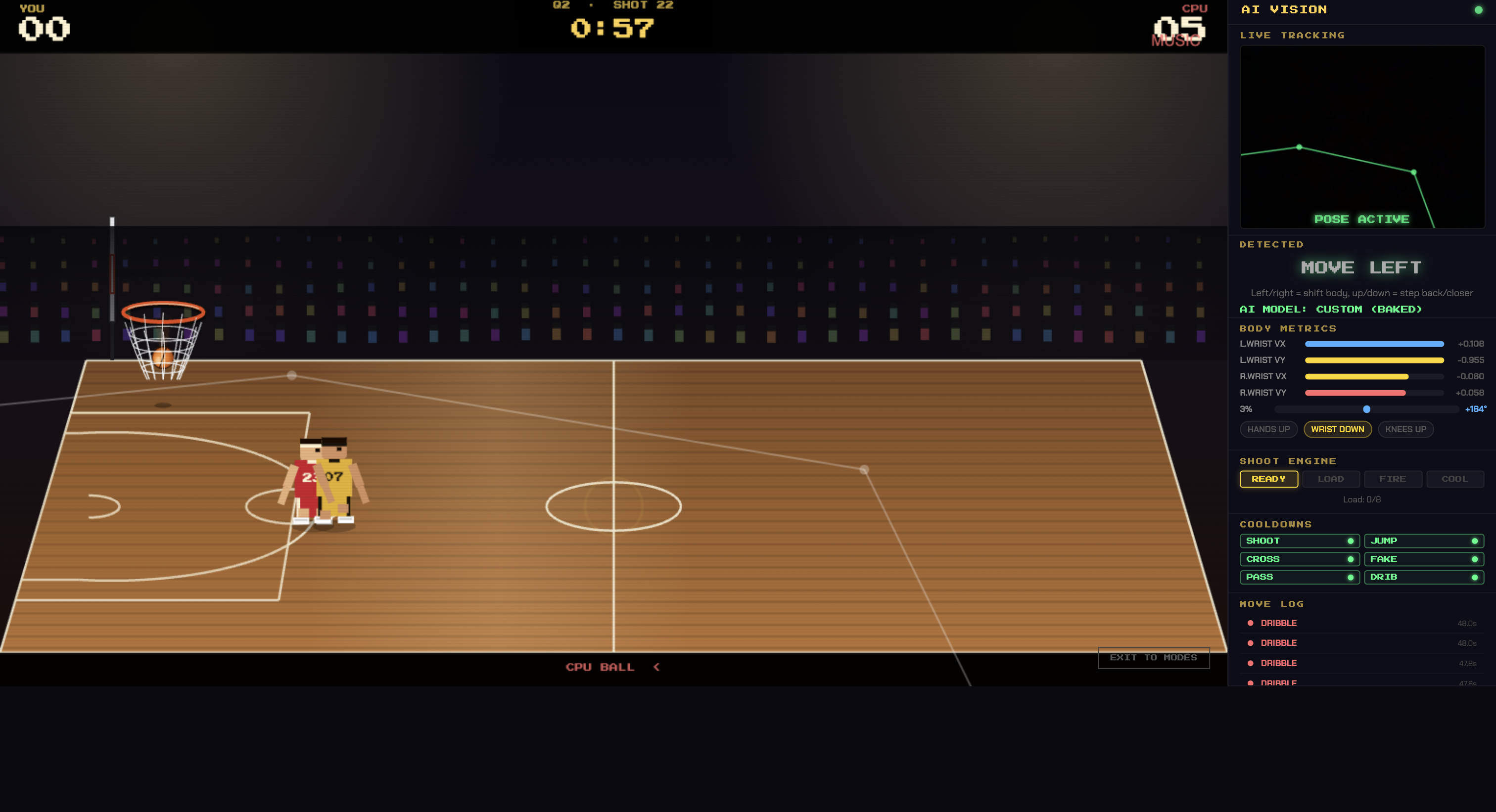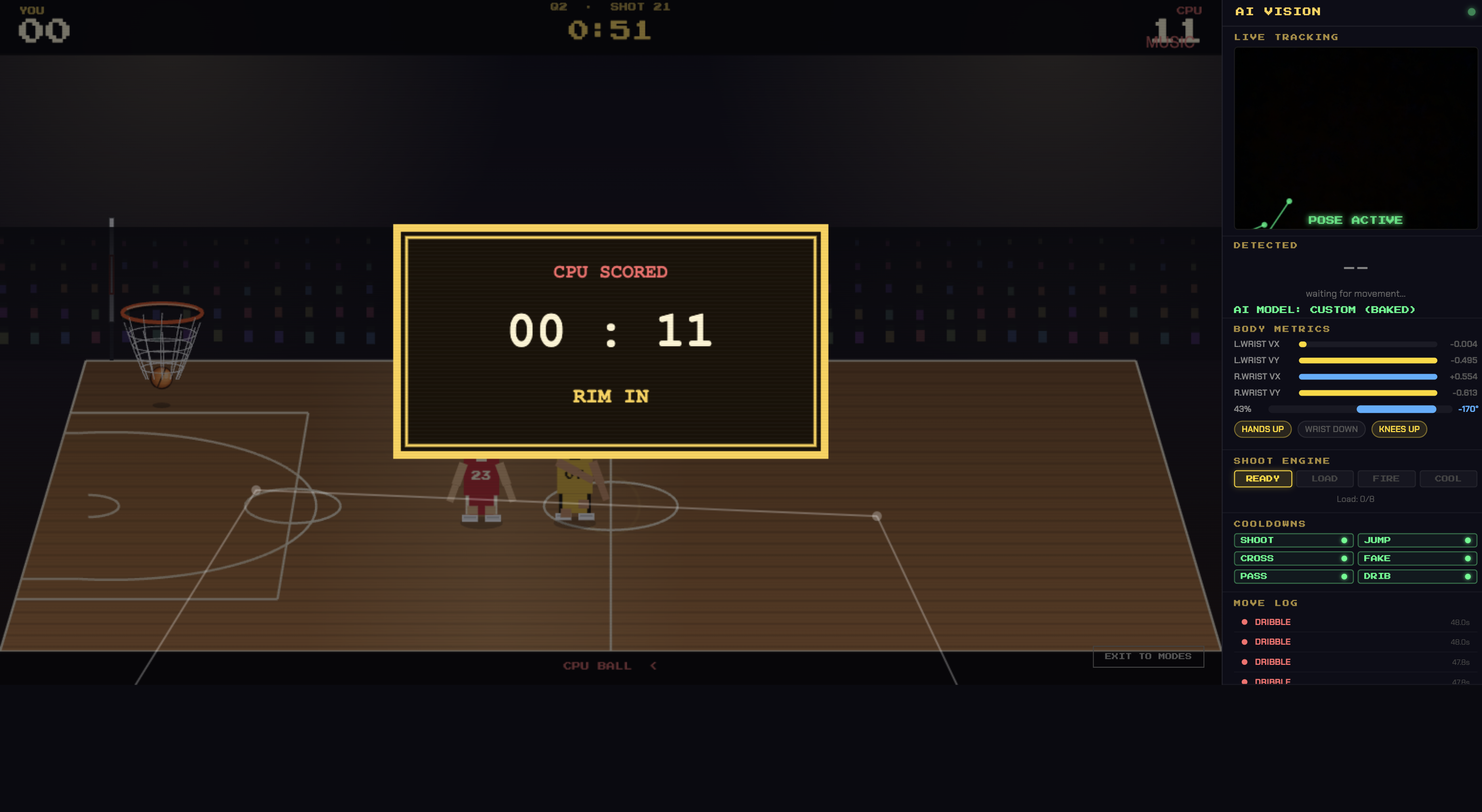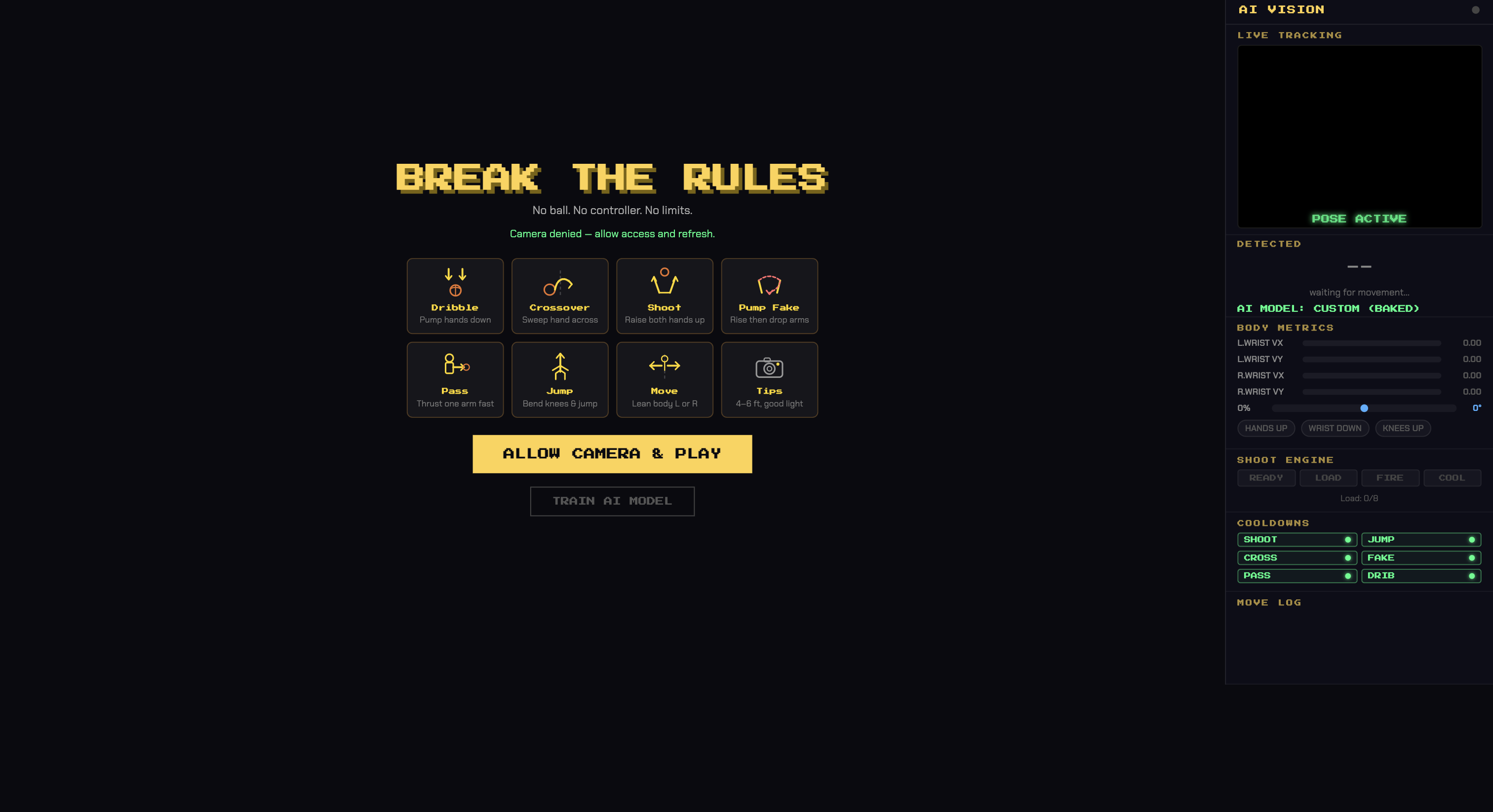 We integrated the theme “Rules Are Meant To Be Broken” by changing how a basketball game is normally played. Instead of using a controller, keyboard, or real basketball, the player uses their body through the webcam. The game reads movements like dribbling, shooting, jumping, passing, and crossing over, then turns those movements into actions on the court.