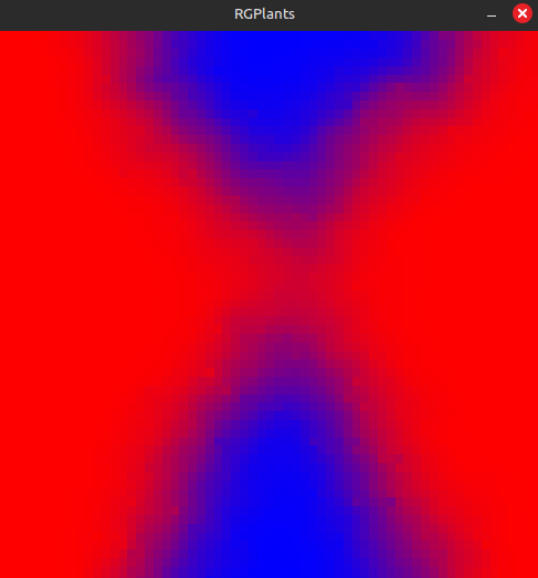 That is a nice little garden you have there! I liked how the averaging and small mutations naturally lead to smooth, nice looking gradients of colours all across the board. I often saw flashes of bright colours that did not last more than a frame; I guess those were single plants that reproduce all around themselves and then got quickly averaged/taken over by their neighbours?