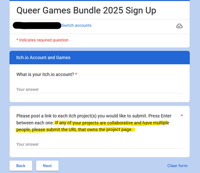 "If any of your projects are collaborative and have multiple people, please submit the URL that owns the project page." This is exactly what I did. I made two applications, each for each itch.io account because... I have two accounts. The form asks for one itch.io account. I'm disappointed this was interpreted as an attempt to double dip, even though it's perfectly clear if you look at the pages that they both link to me. I'm not exactly trying to hide that.