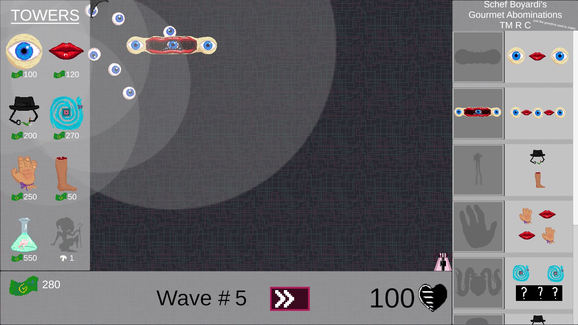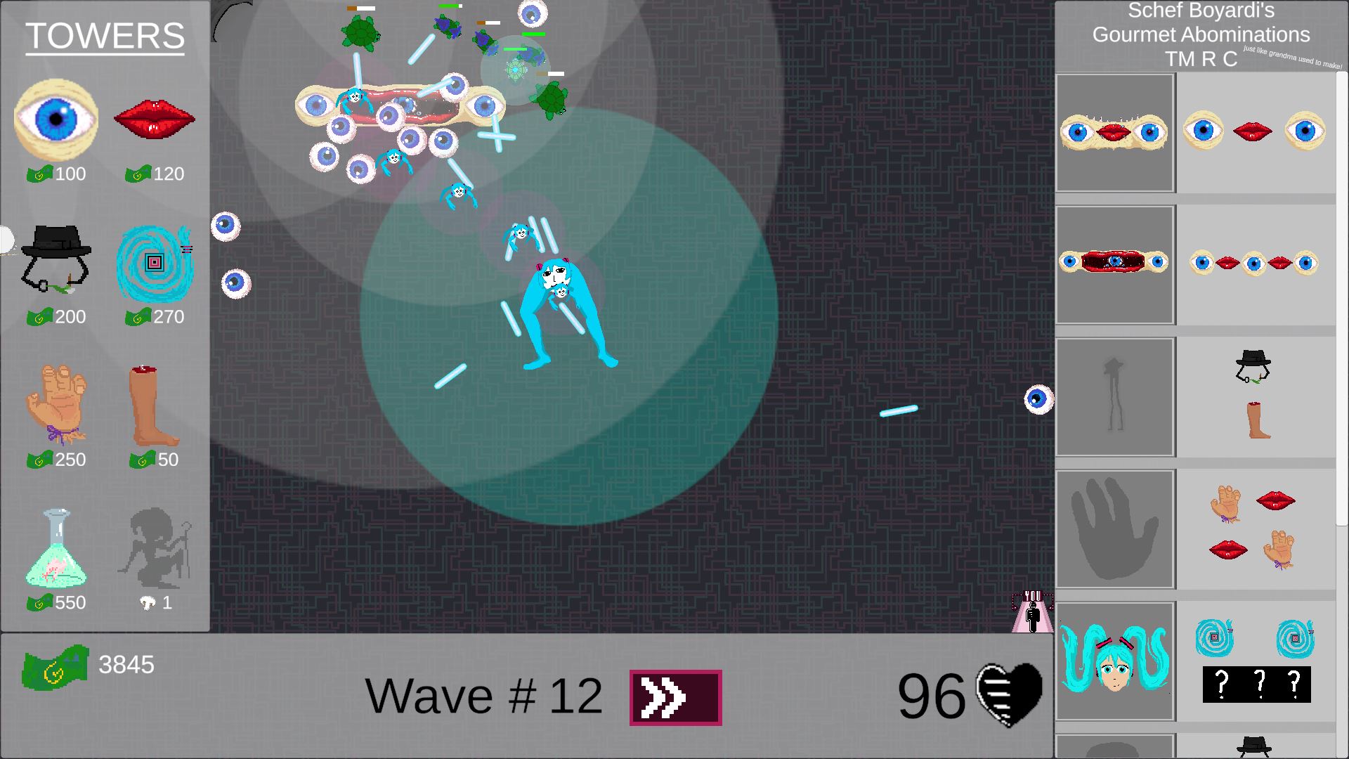This game clearly had a lot of work put into it, there are just a few issues with it that made it hard to play. First, there's so much to read that I think the ability of pause the game would be really nice (unless I just didn't find that option) especially since it starts immediately. I made it to wave 18 before the game froze and I had to close the .exe process. (Every time I try playing it again it crashes randomly when placing towers sometimes.) I was enjoying trying out the fusions (even if the cutscene is a bit long and takes you out of the gameplay, I'd like if there was an option to skip it after the first time) until I found that I couldn't place hands, I could place everything else just fine but hands didn't work, which meant I couldn't try out any of the fusions I assume were locked behind the one with hands and lips in a checker grid pattern. Overall, really good use of the theme! The tower defense gameplay was fun (though I could use an explanation on how the shields work since most of the text felt lore-related and not mechanics related) and I enjoyed the visuals a lot!