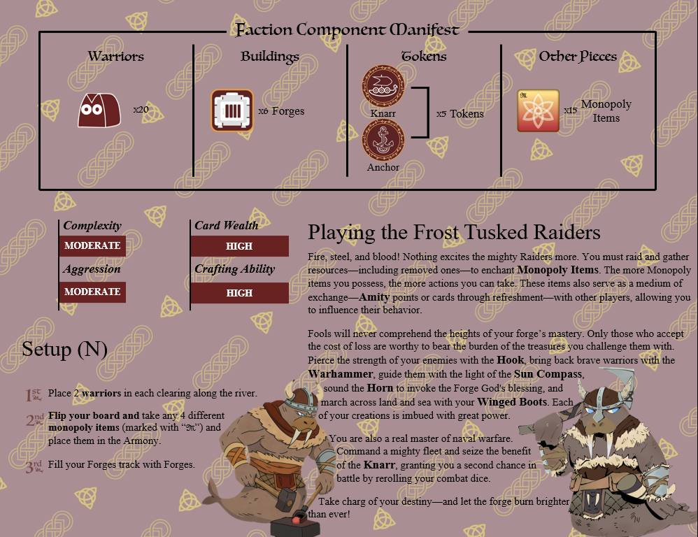 Wowow so creative! Your faction board and artwork are amazing, and your thematics are off the charts! I also love how creative and interactive your factions abilities are! Though I feel it could benefit from 3 ability berries as naval warfare has a lot going on. Great stuff!