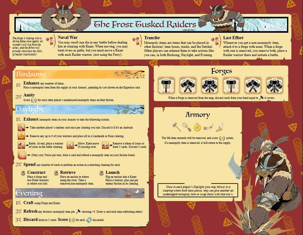 I like the whole economy of items this faction creates for everyone to use. It is a little complex so I might be missing the downside for other players having the monopoly items in their crafted items box. It seems like they would want to exhaust them every turn to get the extra actions, but Chastise and Refresh makes it seem like the Raiders want other players to have a lot of Monopoly items that they leave unexhausted.