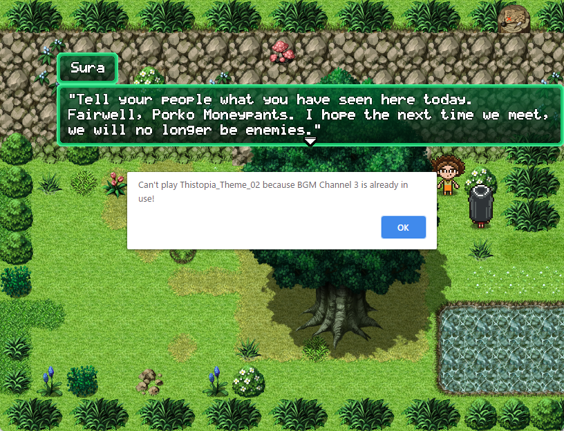 I guess it's mostly up to me usually playing RPG Maker games by mouse not keyboard. In the beginning I found it hard to understand to which place / base to go next and sometimes I seem to be able to use a defeated character again (there probably is a reason, but I didn't see it, so it could as well be a bug). There's also no real fighting screen in the first round, which may be a bit confusing, but I don't think it's bad since it makes the fights feel more varied.