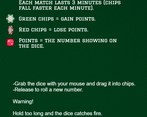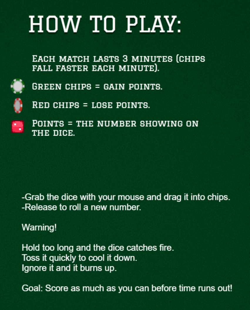 Okay so this game was charming and simple, but it did not implement the theme at all imo, more chips and some gameplay related focus on the dice would have been nice. The SFX were awesome and the bg music was pretty cool, the chips interaction felt responsive and snappy! I am proud to be the current last ranking person on your LB lol