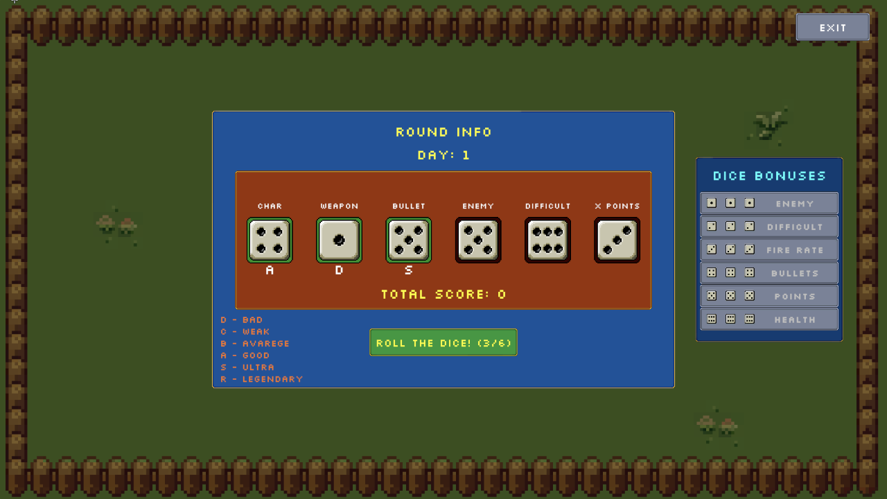 At first I was having really bad rolls and thought the game was really difficult, but then I had a really good roll and I destroyed enemies really fast, I really liked this way of making you feel weak or powerful based on rolls. Really good arcade game! I really enjoyed it :D