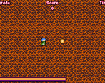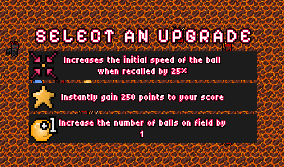 Font is out of place, style is not coherent, mixed pixel sizes are the worst, ball and magma have one pixel size and playable character has double pixel size, some mobs have even bigger pixel size. lastly, magma background has too much contrast, it's a bit painful to look at.
