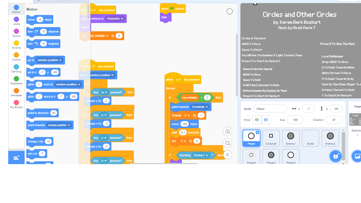 I feel like this game could be excellent with better controls. For example, shooting has too long a reload time for 'Circles in the dark' mode. If I were to suggest anything to change about this mode, it would either be make the light around the player bigger, lower the reload time, or make bullets glow. Otherwise, this game is really fun, and definitely kept me entertained.