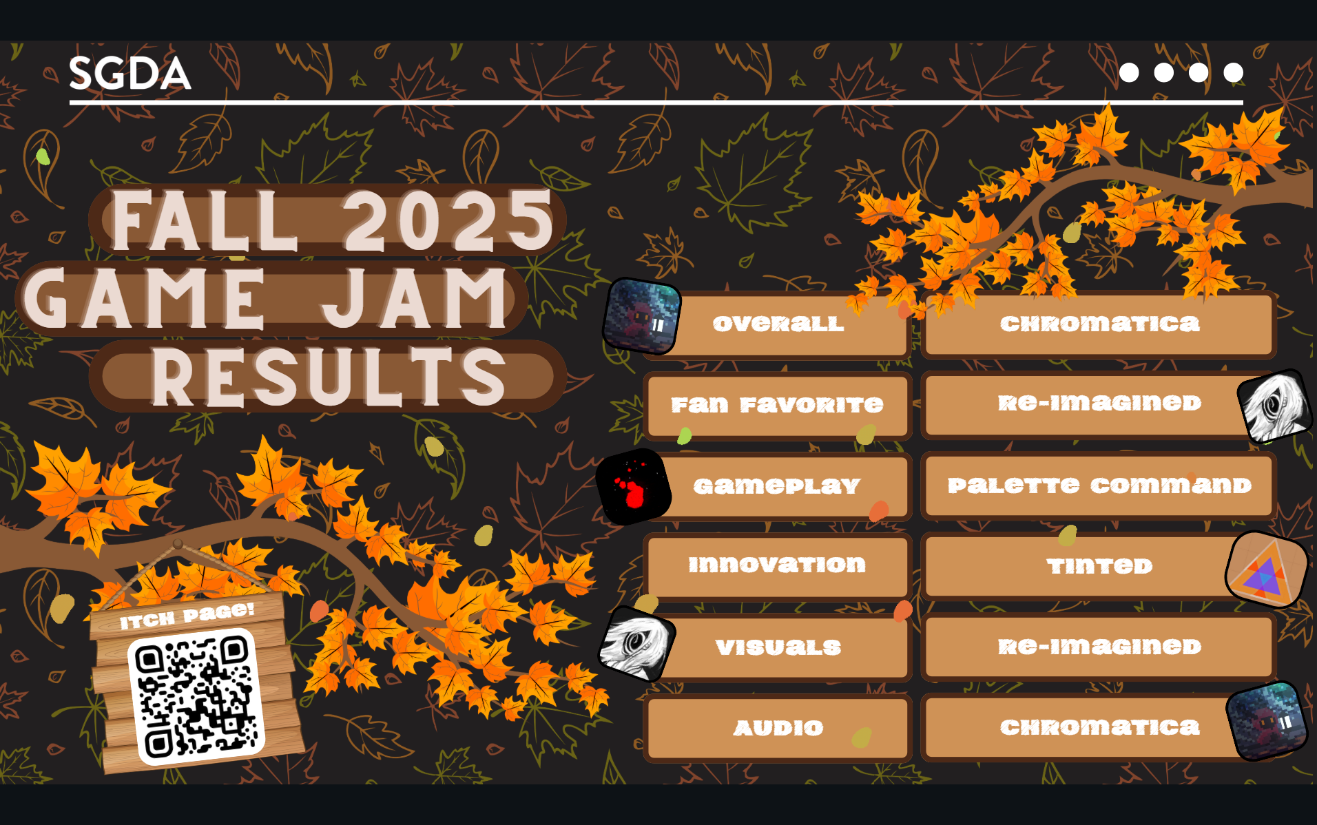 All game jam entries must be submitted to this itch page by SATURDAY, September 27th at 11:59pm. Please reach out to any SGDA officer if you have issues BEFORE the deadline.