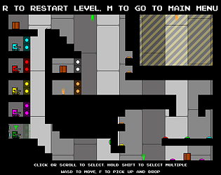 Simultaneously control 5 tank robots that solve puzzles by picking each other up.