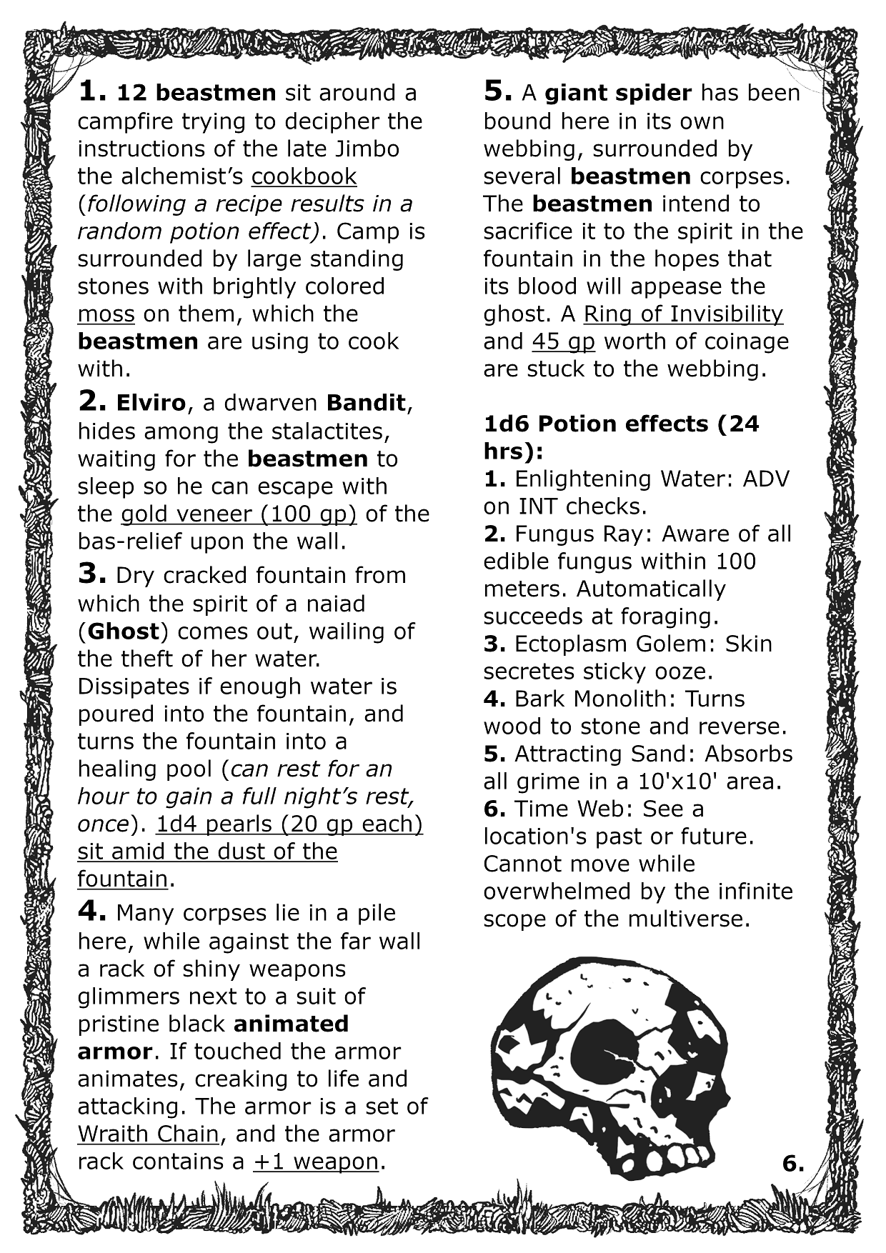 Good product! One thing, though, I feel putting the beastman with the alchemist cookbook in the first chamber of the dungeon feels a bit anticlimactic, since the main rumors the players get is about the missing alchemist. I feel like the "main" objective of the dungeon can be cleared very quickly, without giving any insentive to continue exploring further.