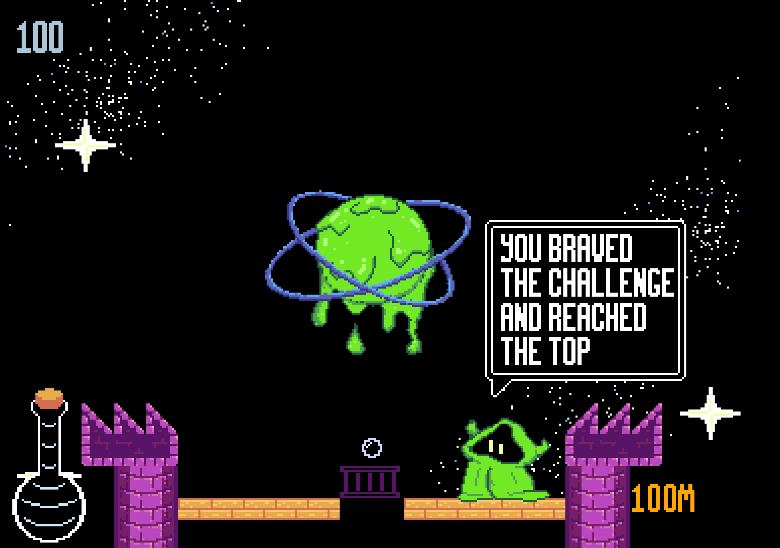 The visuals here are stunning! I absolutely love the vibe - great use of the palette, the music is soothing, and the overall vibe here is very cozy. I will say, I didn't make it very far at all. The charge meter goes up too quickly for me to really make any solid calculations about where my lil orb is going and make significant progress. Only time I was able to make it up to the moving platform simply felt like luck, since it only got on since it got caught between the wall and the platform. I always love a good challenge, but I did think the starting point felt a bit too punishing, especially with there being no quick restart - falling of the little slope in the beginning is essentially a guaranteed loss, so only thing you can do is go into the spikes. Either way, love the wizard dude, and love the vibe of the game!