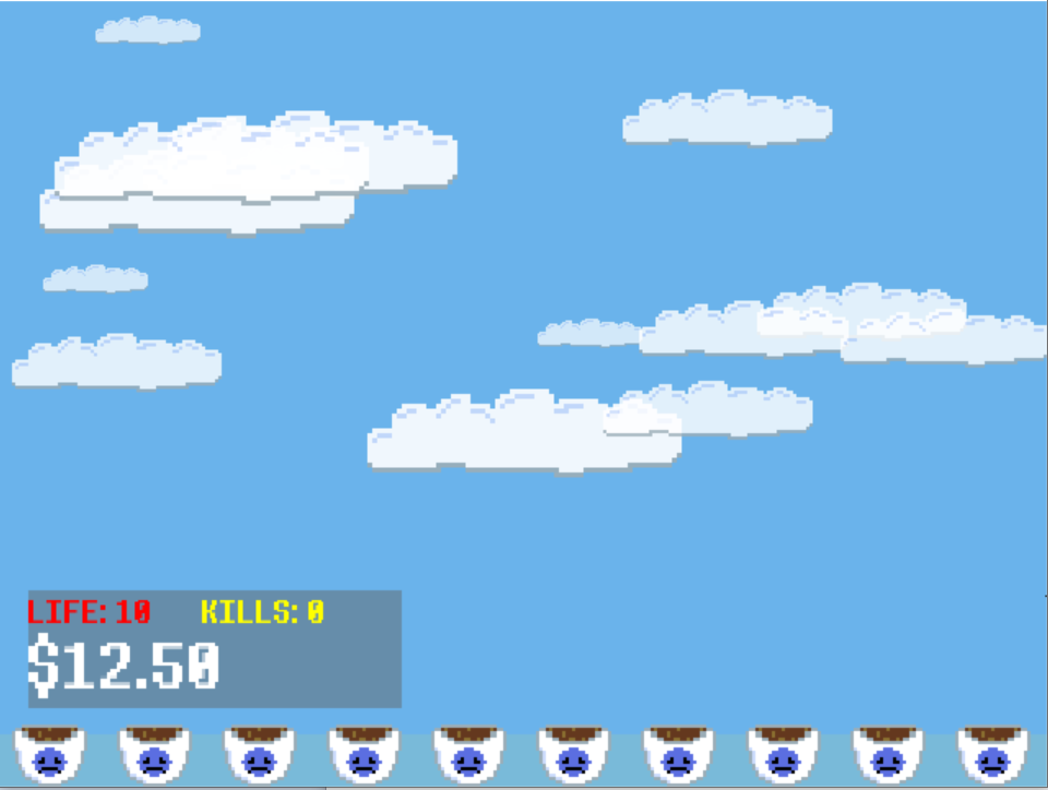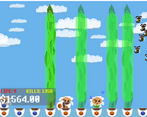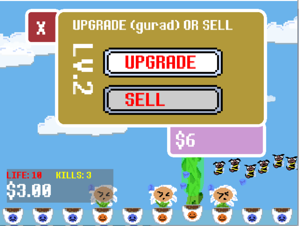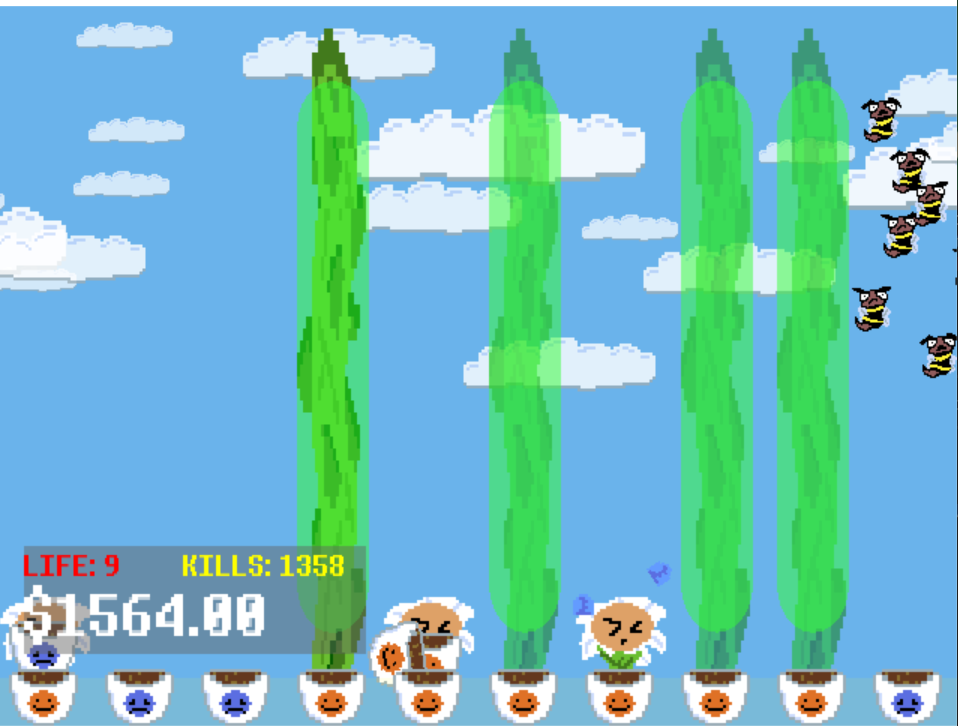 I really like the look of the flowers! I like how at some point the flowers just start throwing flower pots towards the bees. It was quite entertaining but I think the gameplay could be more challenging, since you can easily earn money quite quickly, you can upgrade to the point where bees don´t survive for even a second on screen, which was very satisfying for a little while.