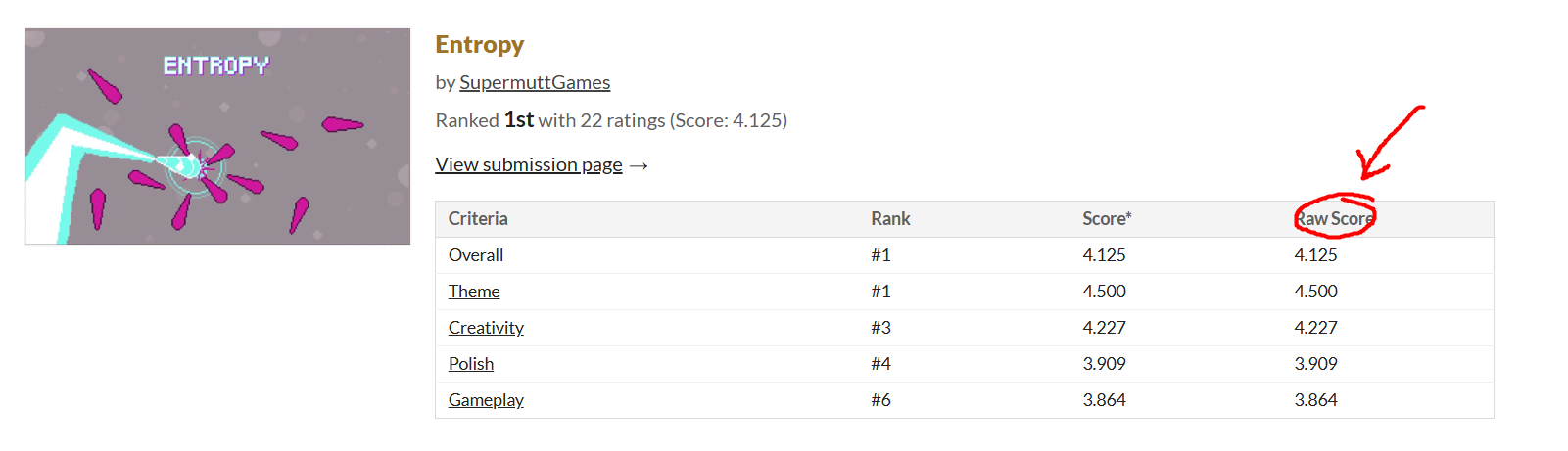 TL;DR, your raw score is the ratings you received, unweighted by how many total ratings you received. The actual score used takes into consideration how many ratings you received. The reason they do that is so that if a game just had, say, a single all 5 star reviews, they wouldn't automatically win.