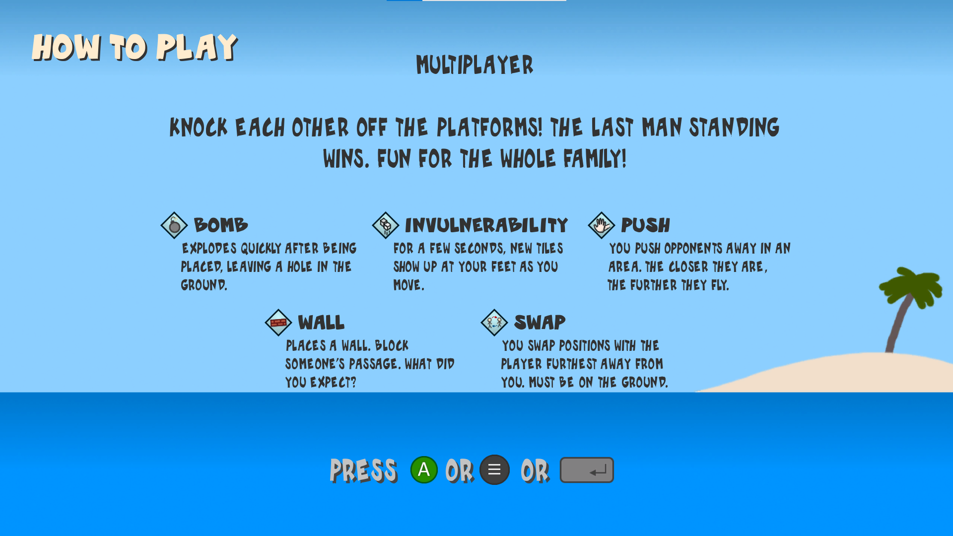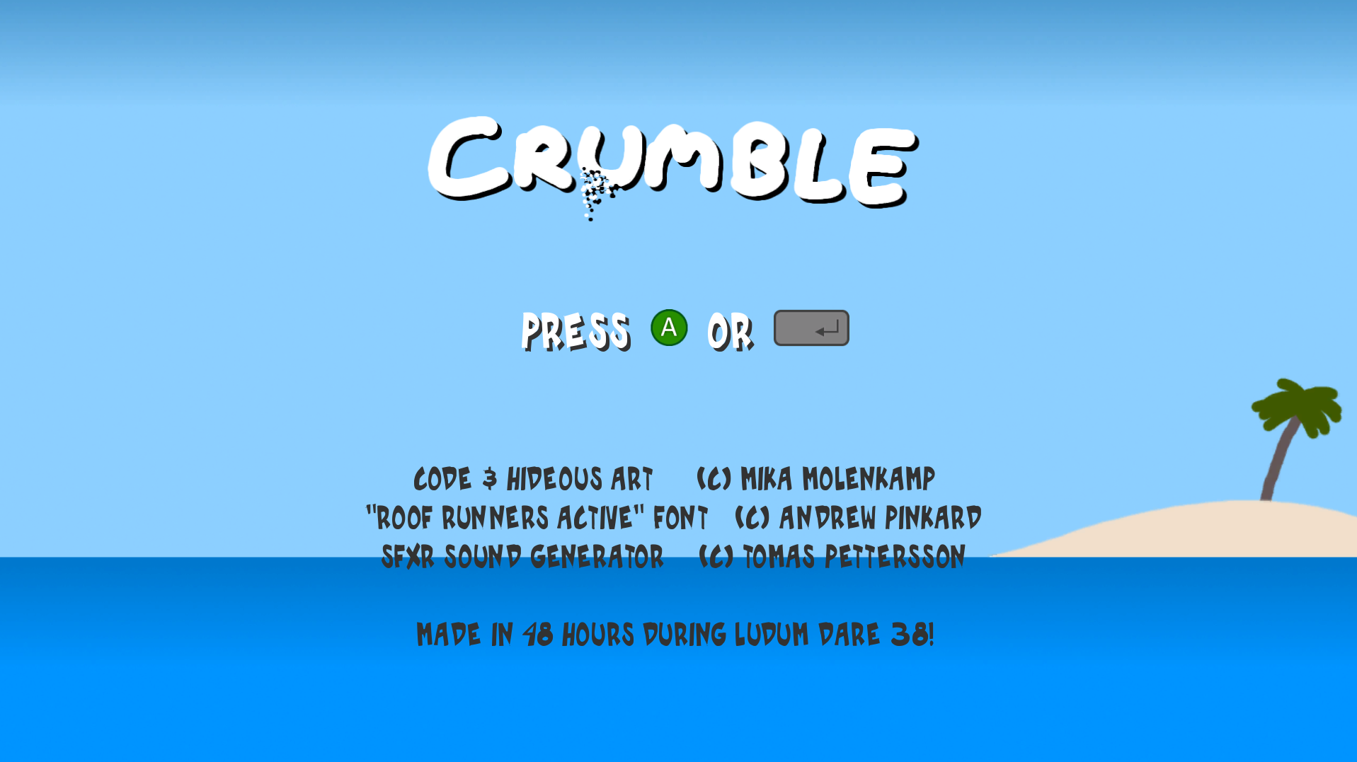 لعبة تختفي فيها الأرض تحت قدميك. في كرامبل، العالم عبارة عن منصة تتكون من صناديق، تتساقط الواحدة تلو الأخرى. الفكرة بسيطة: إذا سقطت، خسرت. في وضع اللعب الجماعي، يمكنك الوصول إلى مجموعة من التعزيزات التي تساعدك على مواجهة خصومك. حاول إسقاطهم من الحافة - آخر لاعب يبقى على قيد الحياة يفوز! هذه هي الطريقة المُعتادة للعب. في وضع اللعب الفردي، تلعب لعبة هجوم الوقت حيث تحاول الصمود لأطول فترة ممكنة. لا تزال القواعد القديمة سارية، بما في ذلك عداد تنازلي: إذا نفد الوقت، خسرت.