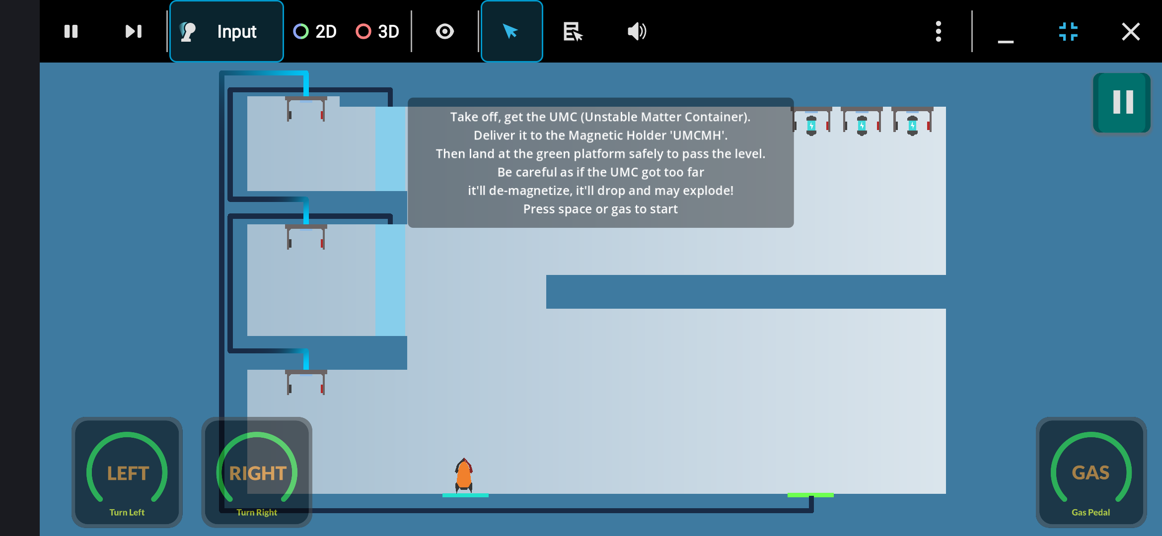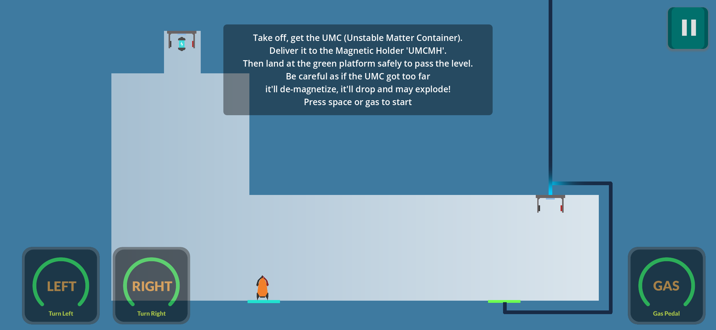 أبرز مهاراتك في قيادة الصاروخ لنقل حاويات المادة غير المستقرة و تسليمها بدقة و تأنٍ من دون خدش جسم الصاروخ أو صدم الحاويات، ثم اهبط بسلام لإكمال المهمة، حاول إتمام المهمة بأسرع وقت و أقل استهلاك للوقود للفوز بنجوم إضافية.