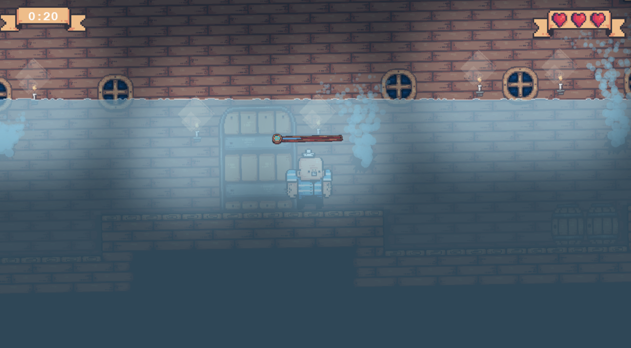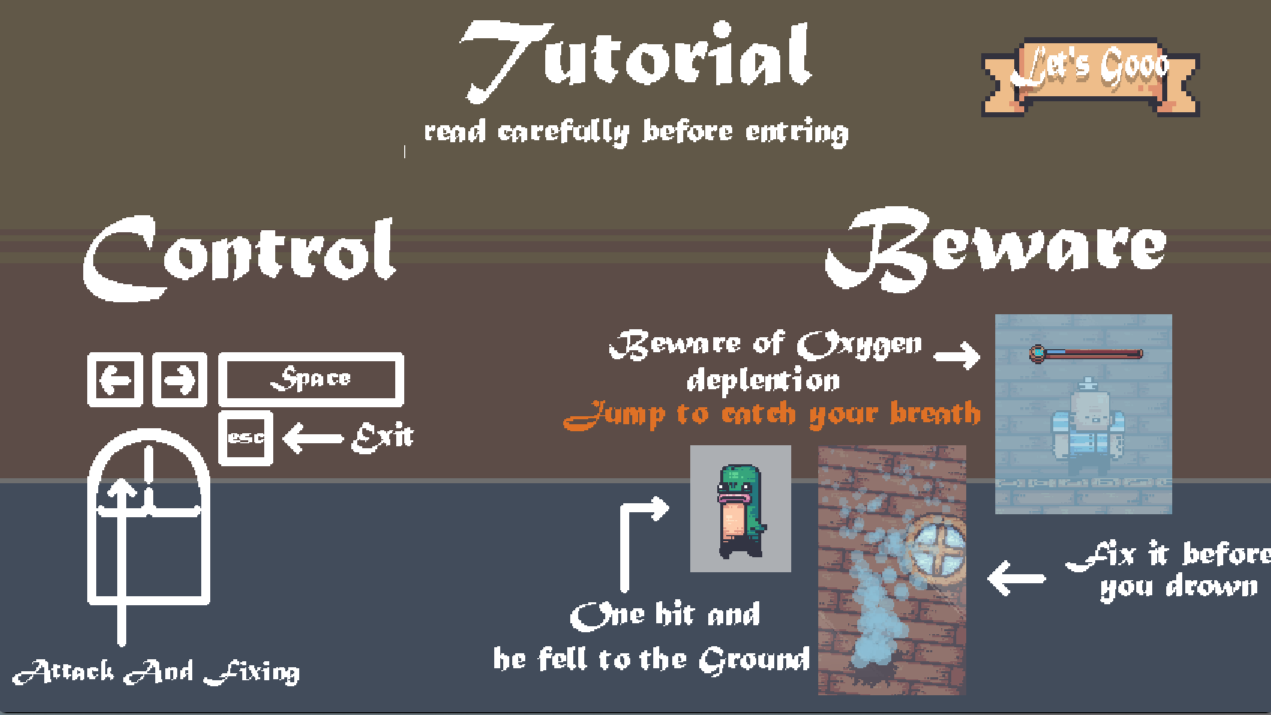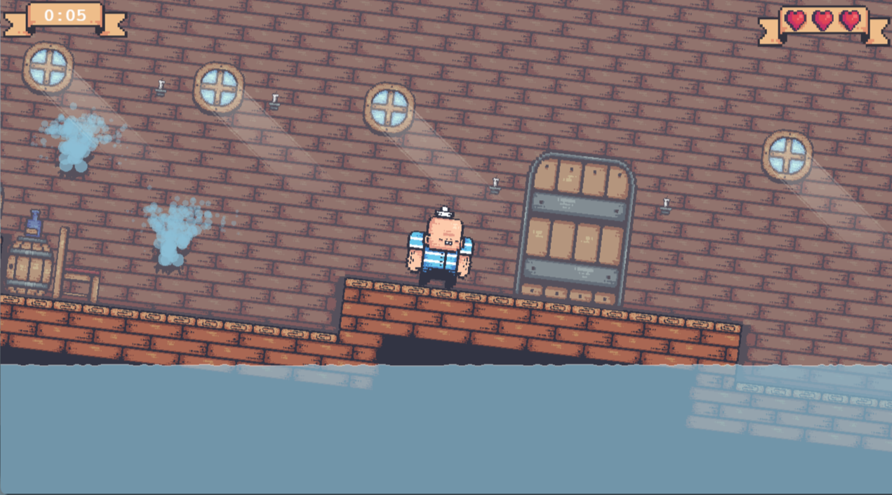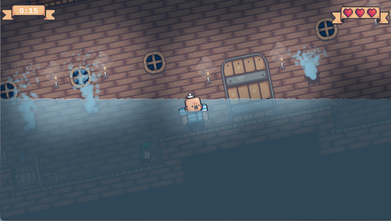 انت في سفينة غير مستقرة بسبب الامواج داخل عاصفة و تظهر فيها تقوب بسبب العاصفة يجب عليك اصلاحها قبل ان تغرق و البقاء اطول مدة ممكنة. توجد مشكلة في التعليمات القفز ب سهم الاعلى ليس بالمسافة