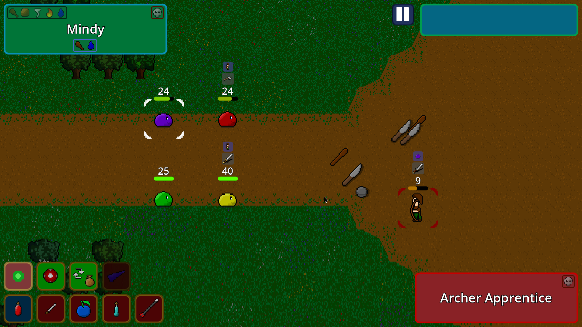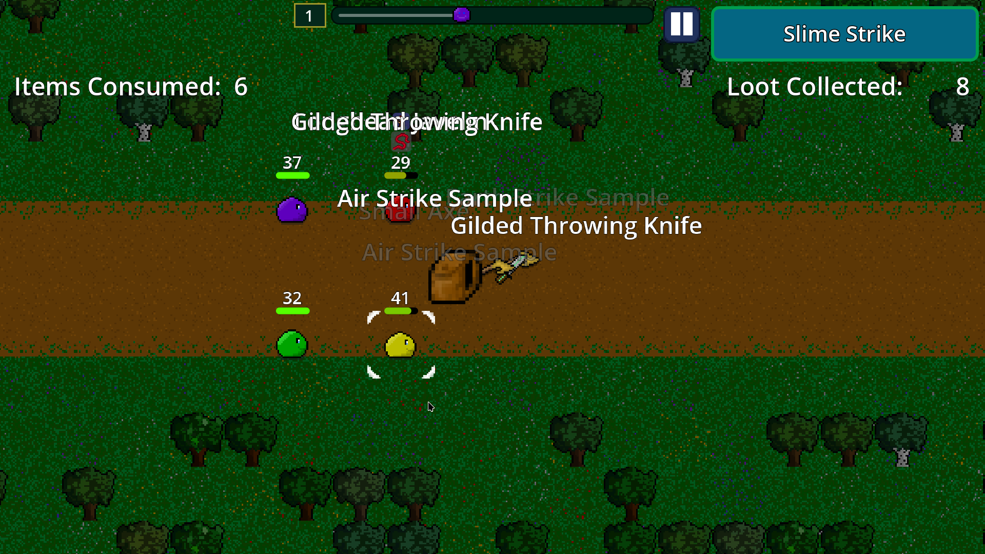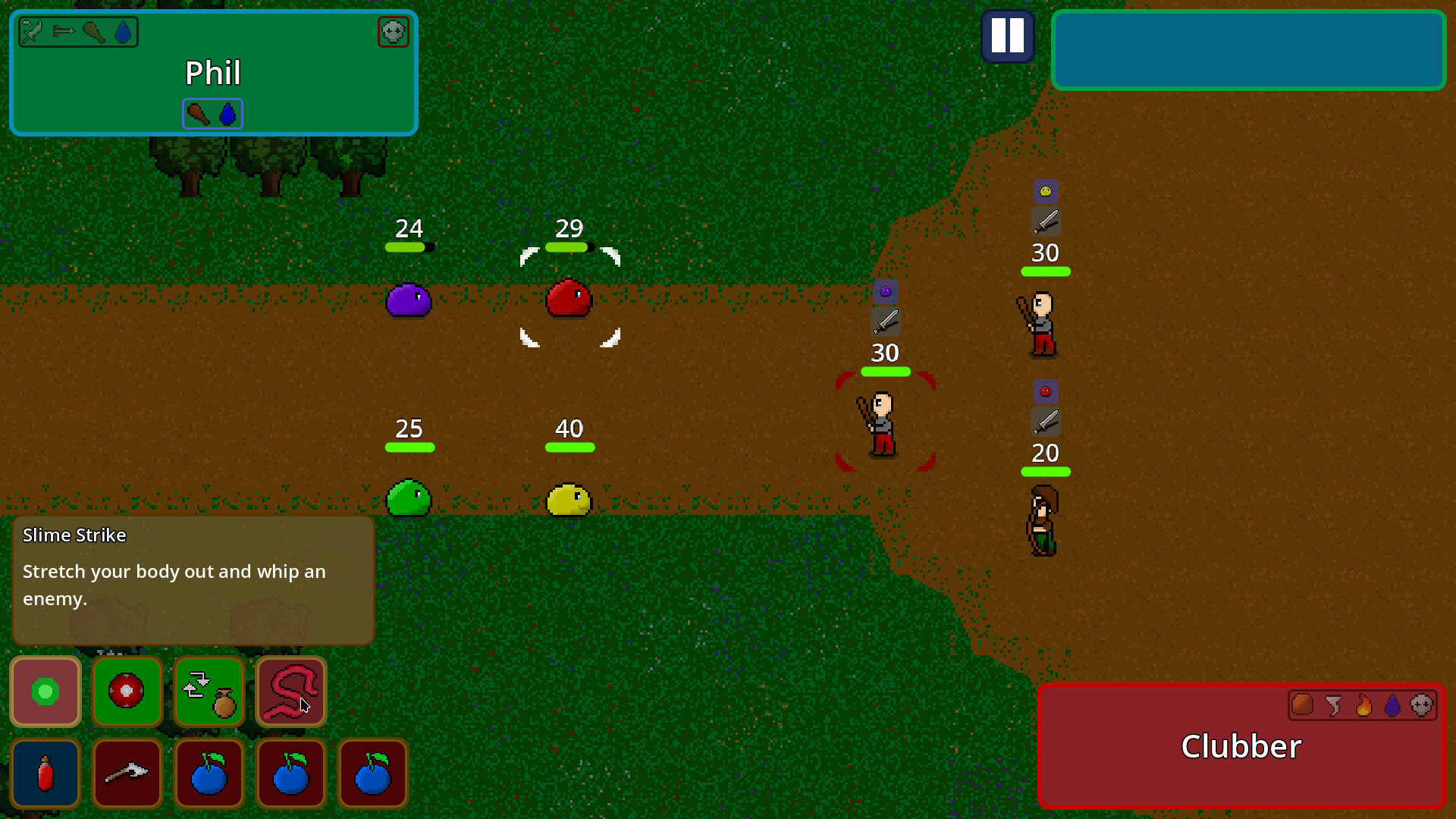 The affinities will be shown off more as you progress. The elemental potions and scrolls can actually be more powerful, but are rare this early. I'm planning to update the tutorial with more elemental items and having a turn discussing them to show how each Slime's affinities will affect the damage done. We're also going to add some random events to the game, including while travelling. Some will include chances for you to find and forage for the various berries that the Slimes would normally eat, so that you are not just using the equipment of the invaders. We are considering random merchants on the roads, as well as shops in the towns.