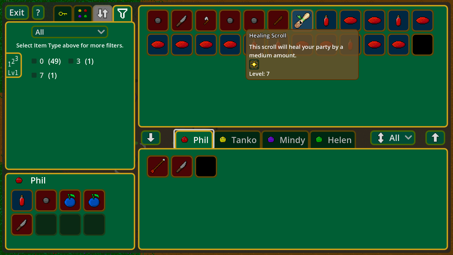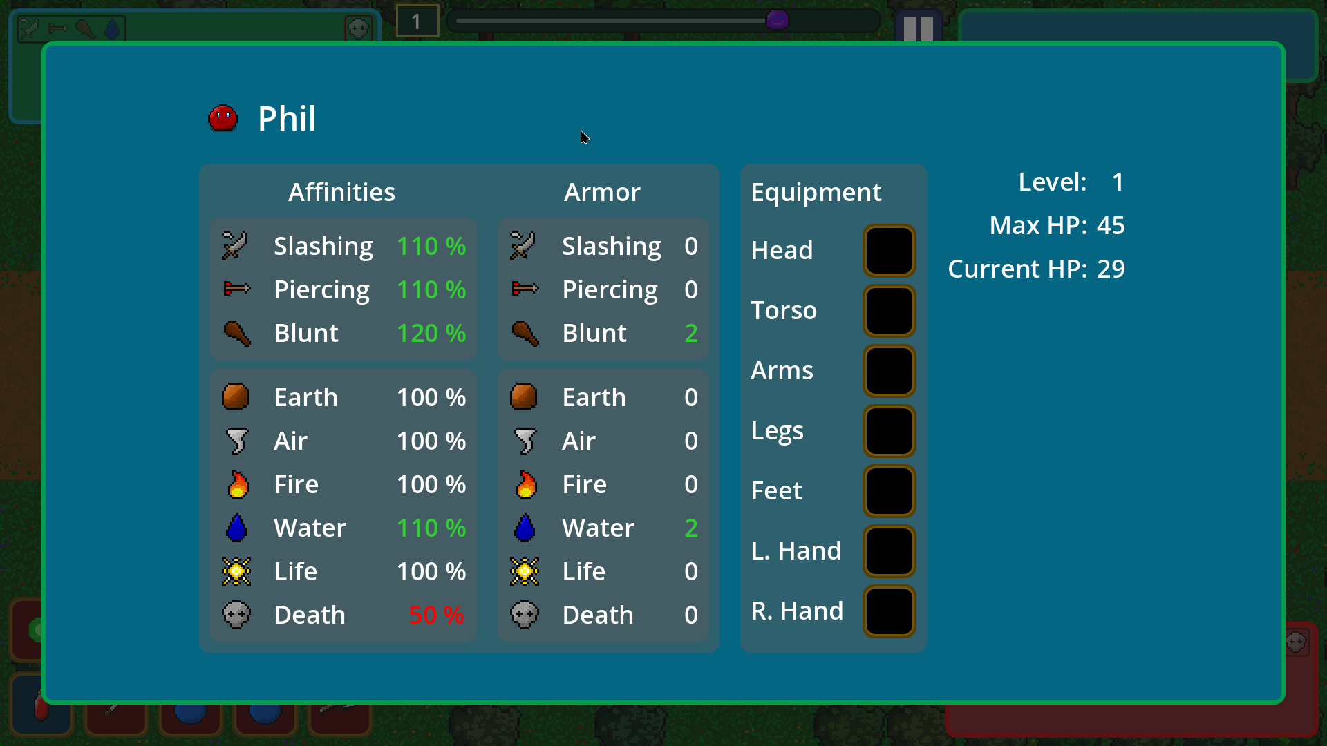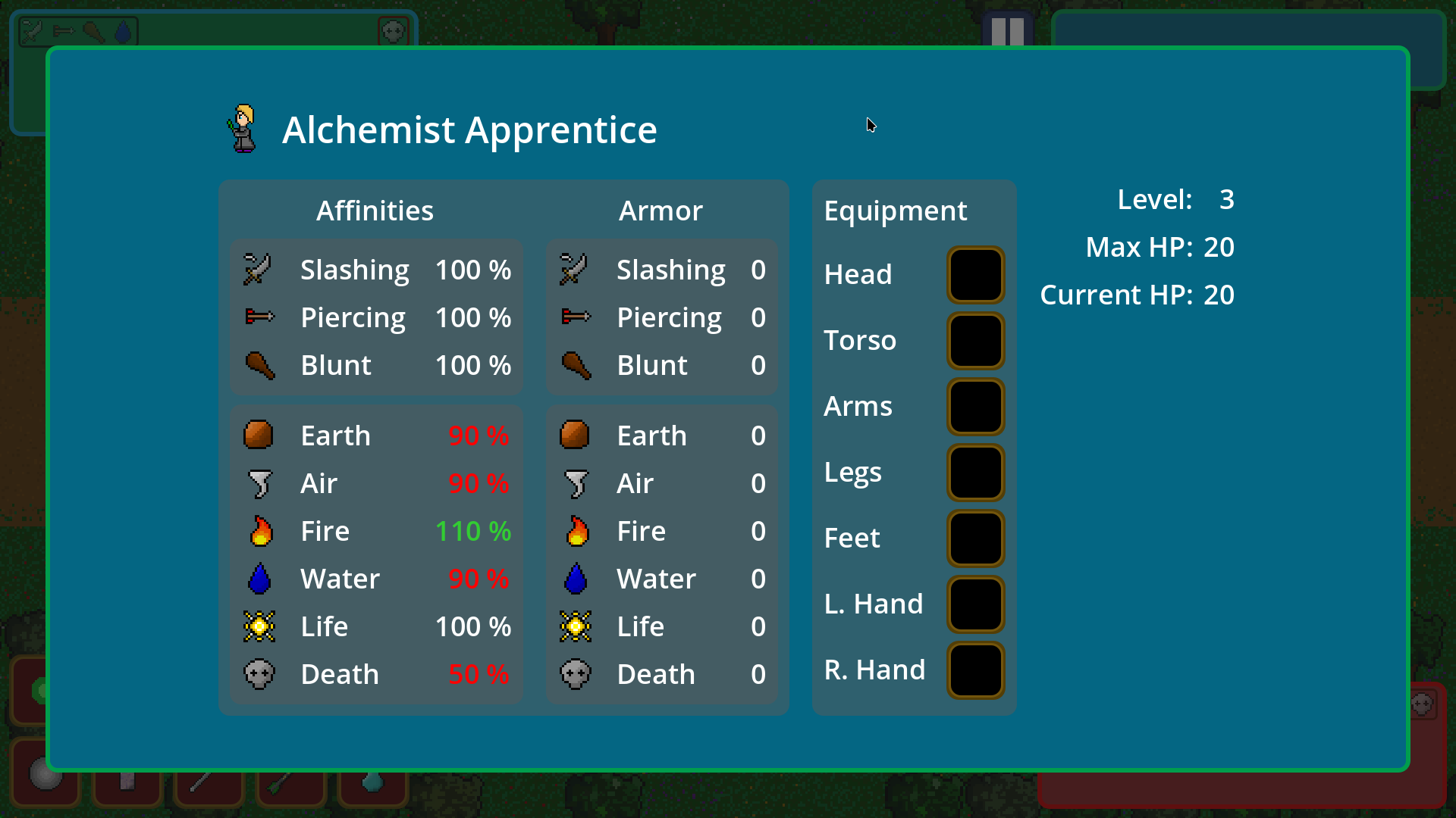 The affinities will be shown off more as you progress. The elemental potions and scrolls can actually be more powerful, but are rare this early. I'm planning to update the tutorial with more elemental items and having a turn discussing them to show how each Slime's affinities will affect the damage done. We're also going to add some random events to the game, including while travelling. Some will include chances for you to find and forage for the various berries that the Slimes would normally eat, so that you are not just using the equipment of the invaders. We are considering random merchants on the roads, as well as shops in the towns.