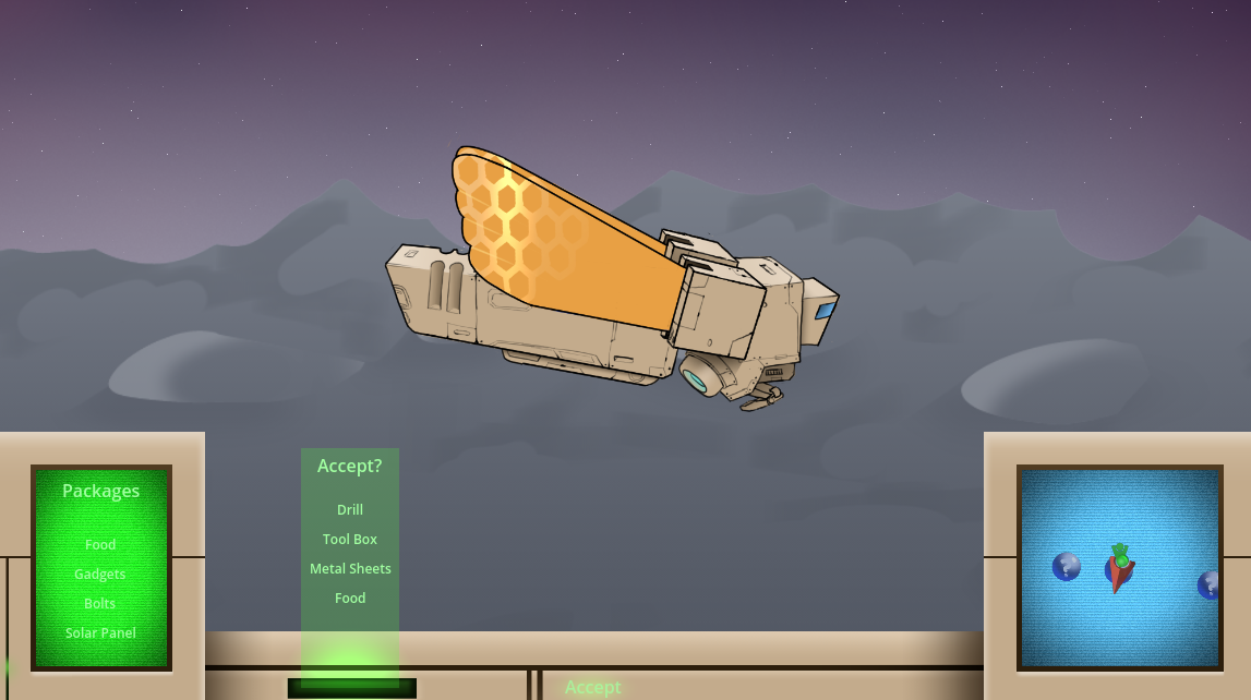 The ship design is very creative, and I really liked the overall look of the project. Extra creativity points for using sailing in a sci-fi setting and not doing something sea related! I had a little bit of difficulty understanding the mechanics related to the deliveries. I was unsure of the target of the delivery and was able to deliver things to the same location that I picked them up from.