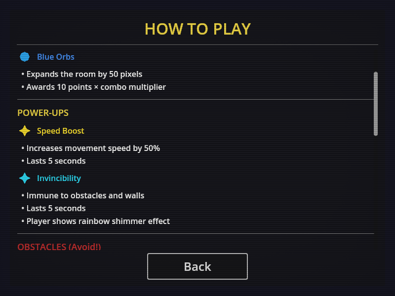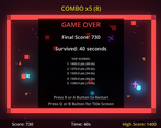 I love the audio the most. But that cool grid that bubbles around you is pretty sweet, tbh. Very slick game. The colors are just phenomenal. I feel like this would be cool to have an adventure version too. Like flying through space as caverns are closing and such with blue orbs giving you space. Either way....super cool idea, works great, fits the theme.
