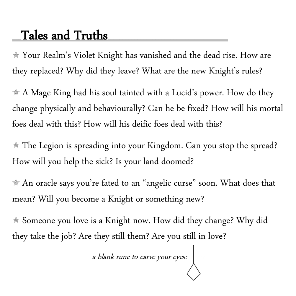 I like the question about Lucid! Maybe we could see it that the narrator was "woken" by the ritual of opening the book? If you wanna be overly meta, maybe it was woken by the ritual of calling for the zines to be made. To me, they're sleeping restlessly since they want to be awake and unsupress their power. They're 'Lucid' since they still have autonomy, it's just solely in their imprisonment and mortals need to reach out to bridge the gap and let them have agency on the waking world.