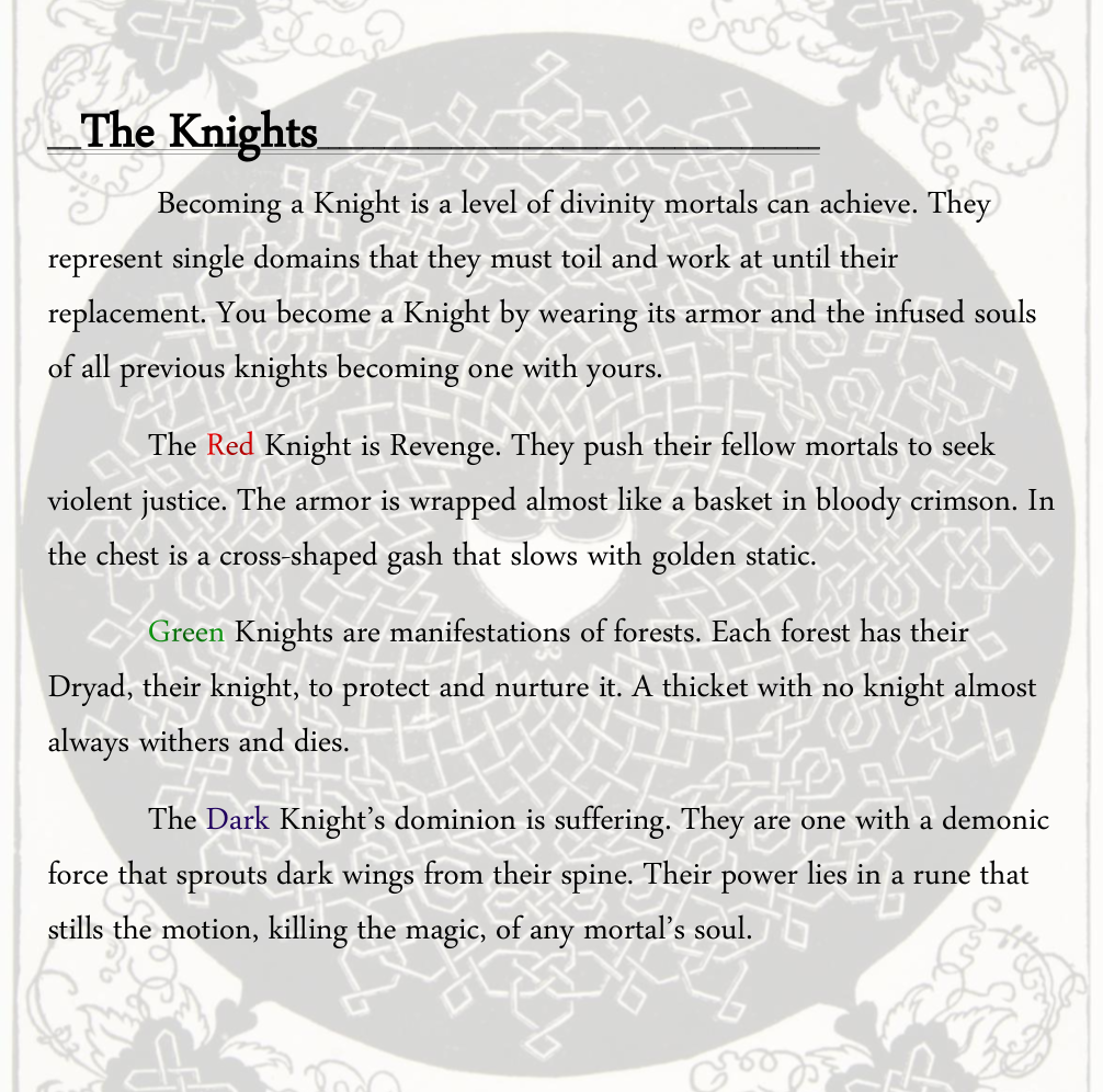 Thanks for reading! I actually meant to note at the end that in your own games you can determine what you wish about any sort of chromatic/shades of Knights. It's meant to be something people can modify add to for their own interpretations. In fact, Dryads being "Green Knights" is something my friends inspired me on for our games. Like if you wanted a Silver Knight, you could have one!
