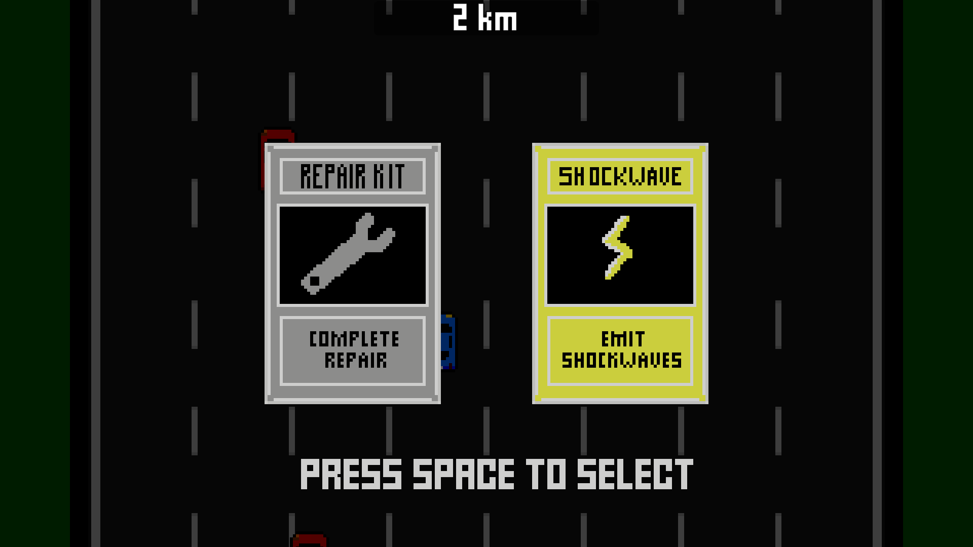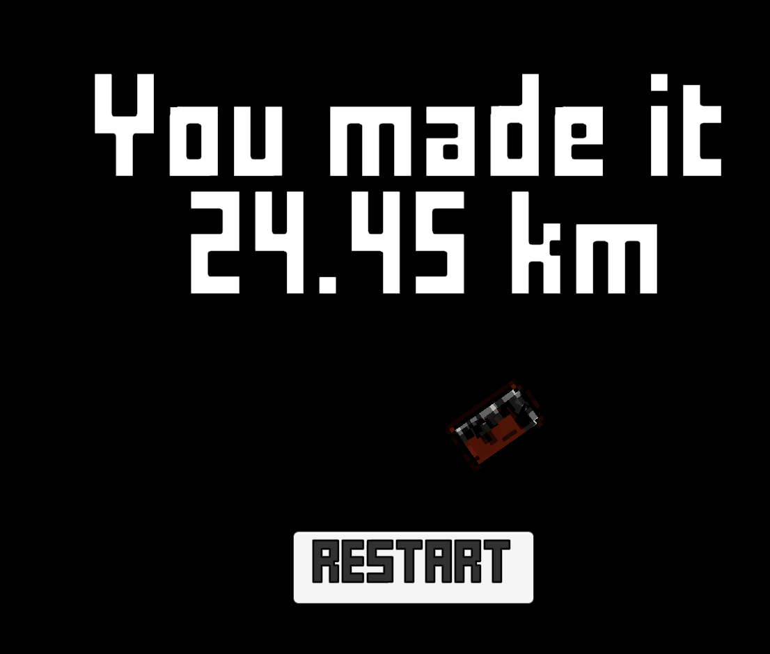 The gameplay loop is addictive, the visuals & car details are really well polished, the audio provides some really humorous sound effects... this game feels so polished for a jam game! At the end I made it to 20.41km...I will try again next jam/before next jam!