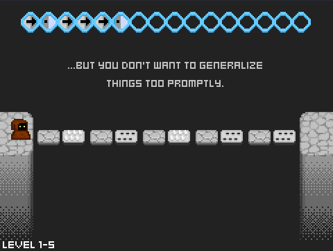 I did find that there was a significant difficulty spike just after the jump is introduced as you're quickly made to learn 2 (3 depending on how you count it) mechanics more-or-less at once which is a lot to take in. I would probably suggest giving each mechanic a little more time to breathe on its own to help build starting intuition with each new piece added.