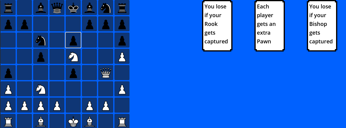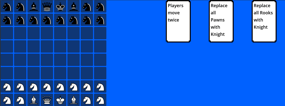 A Fun and Nice Game concept. I think a fun idea would be to provide a draft pool of cards, and 1 player picks one, another player picks one, and the game will choose the final card. Finally a Chess 2 Update.