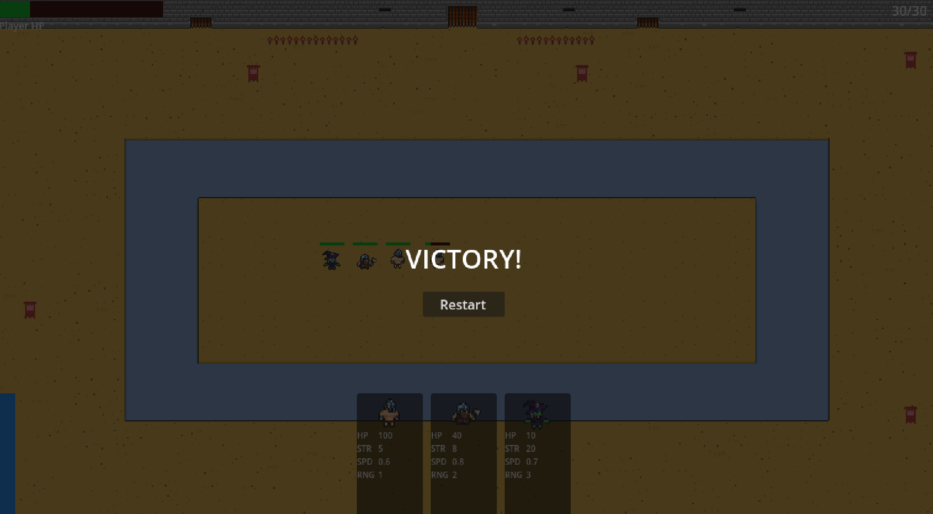 Nice game. I was defeated the first time I played, then got victory the second time. I like the idea, implementation and use of music and sound. The only gripe I have is that the indicator in the top right about how many enemies you've defeated is quite small with white text blending in a bit against a grey background. Bigger text, and perhaps pulsing the text when you defeat an enemy would have been nice.