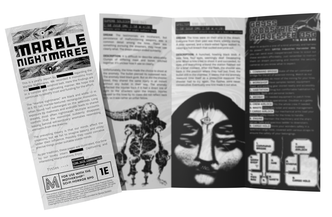 A fun little mini-bestiary, containing four eldritch horrors and a spaceship. The layout and presentation is good, with amazingly unsettling art pieces, and the horrors are easy to drop into a game.The text could use a line editor, as the sentence structures can feel a bit clunky at times, and does not quite fit the in-world corporate report tone the pamphlet is going for, but this is a minor nitpick.