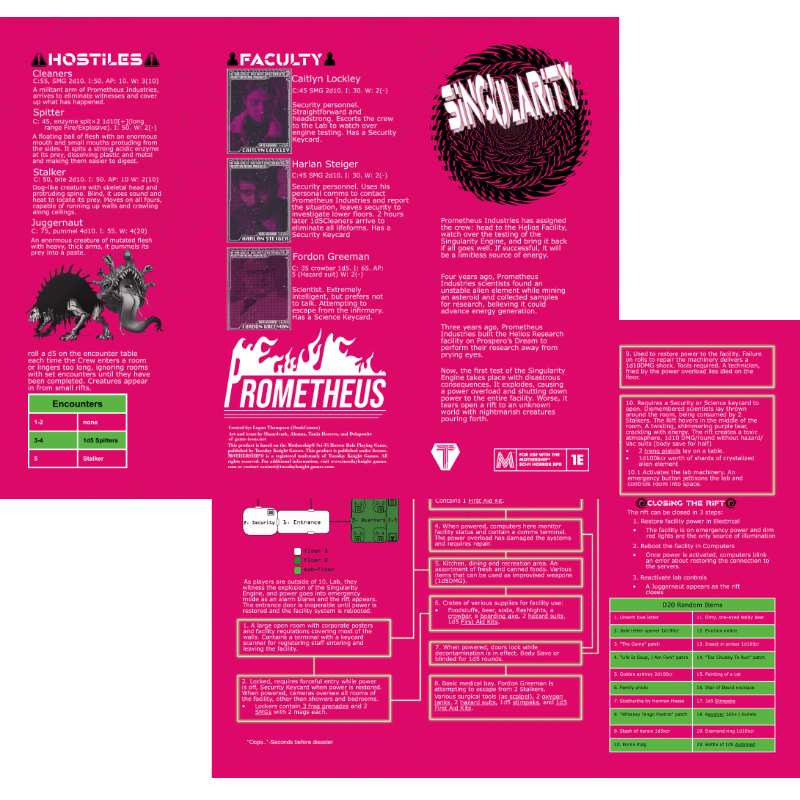 A nice map provides a good overview of the facility, and the room information is well organised in textboxes, but the body font is not great for reading large amounts of text, an issue which is exacerbated by the white text on magenta background colour scheme. The module could have benefited from leaning even further into its source material and cribbing the minimalistic aesthetic of Half-Life.