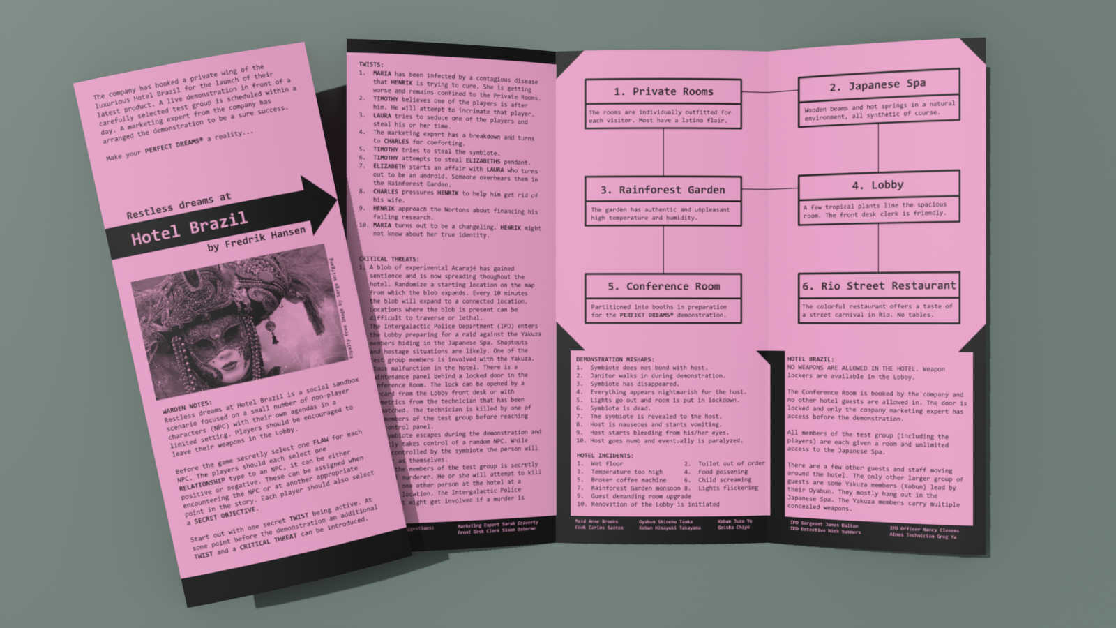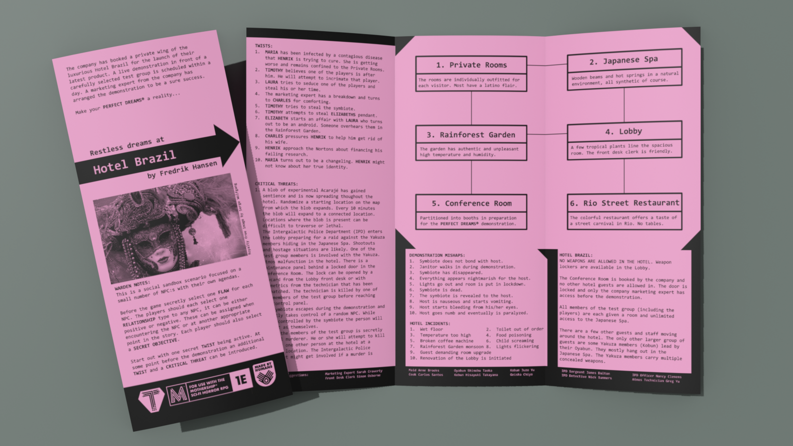 This one's dense - really dense! A lux hotel, a product demonstration gone wrong, a cast with their own relationships and randomized PC relationships, plus a whole host of complications and secret objectives... I'm impressed, but slightly overwhelmed! This feels like it's outgrown the trifold format and would *sing* as a short zine, it's honestly somewhat daunting in the current form factor. You've got SO MUCH good stuff here, but I wish it all had more room to breathe, or that some of the wordcount went to more basic things like pay for the job or mechanics for the symbiote.