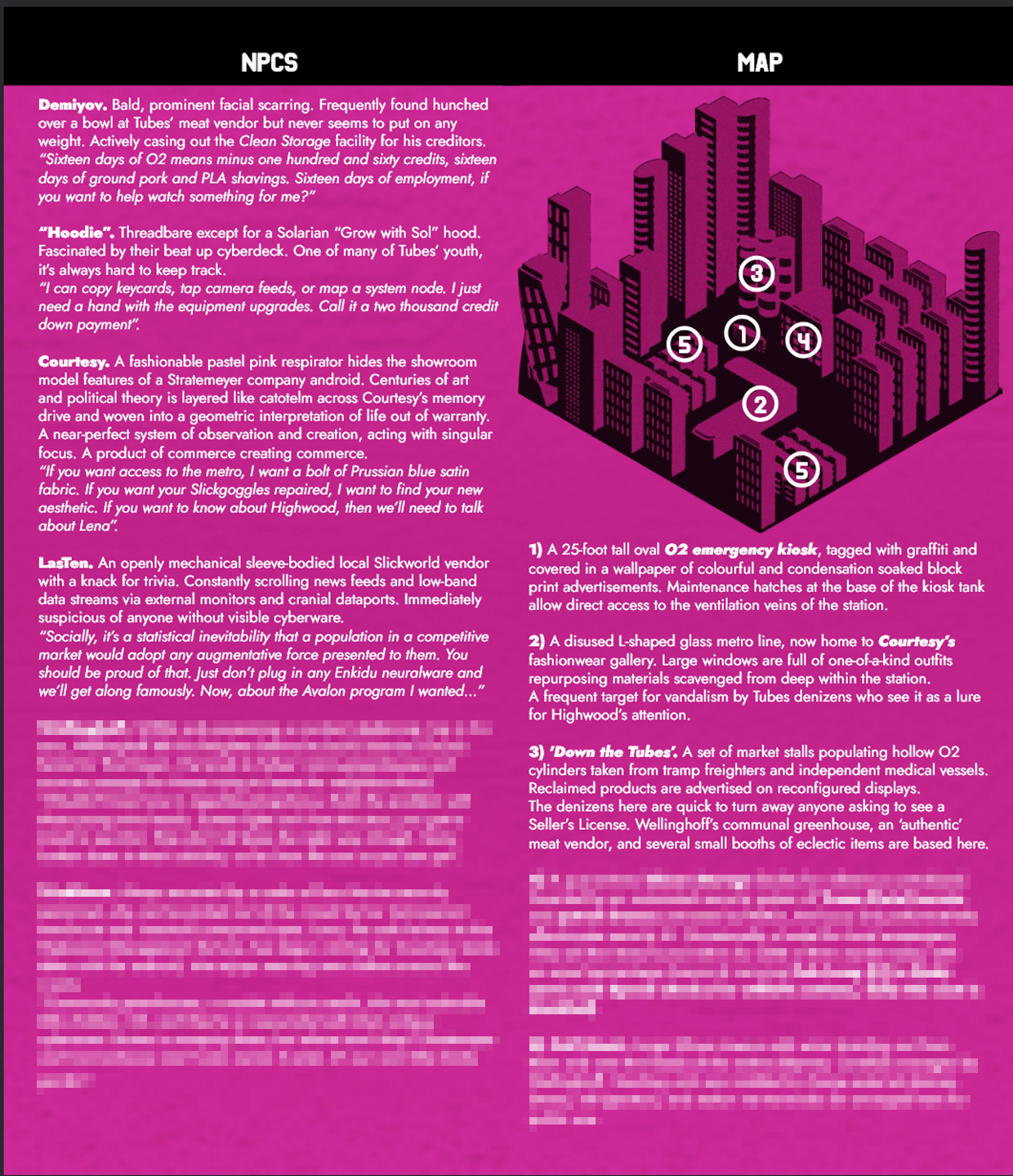 I love the colors, layout, and the map! It did take me a re-read to figure out if this is part of The Choke or part of Prospero's Proper. But I love the premise and there's so much to go off of there. The events are very fun and show that it's a dynamic area with plenty for any Warden to expand upon (looking at you mysteriously conscripted corpos individuals!)