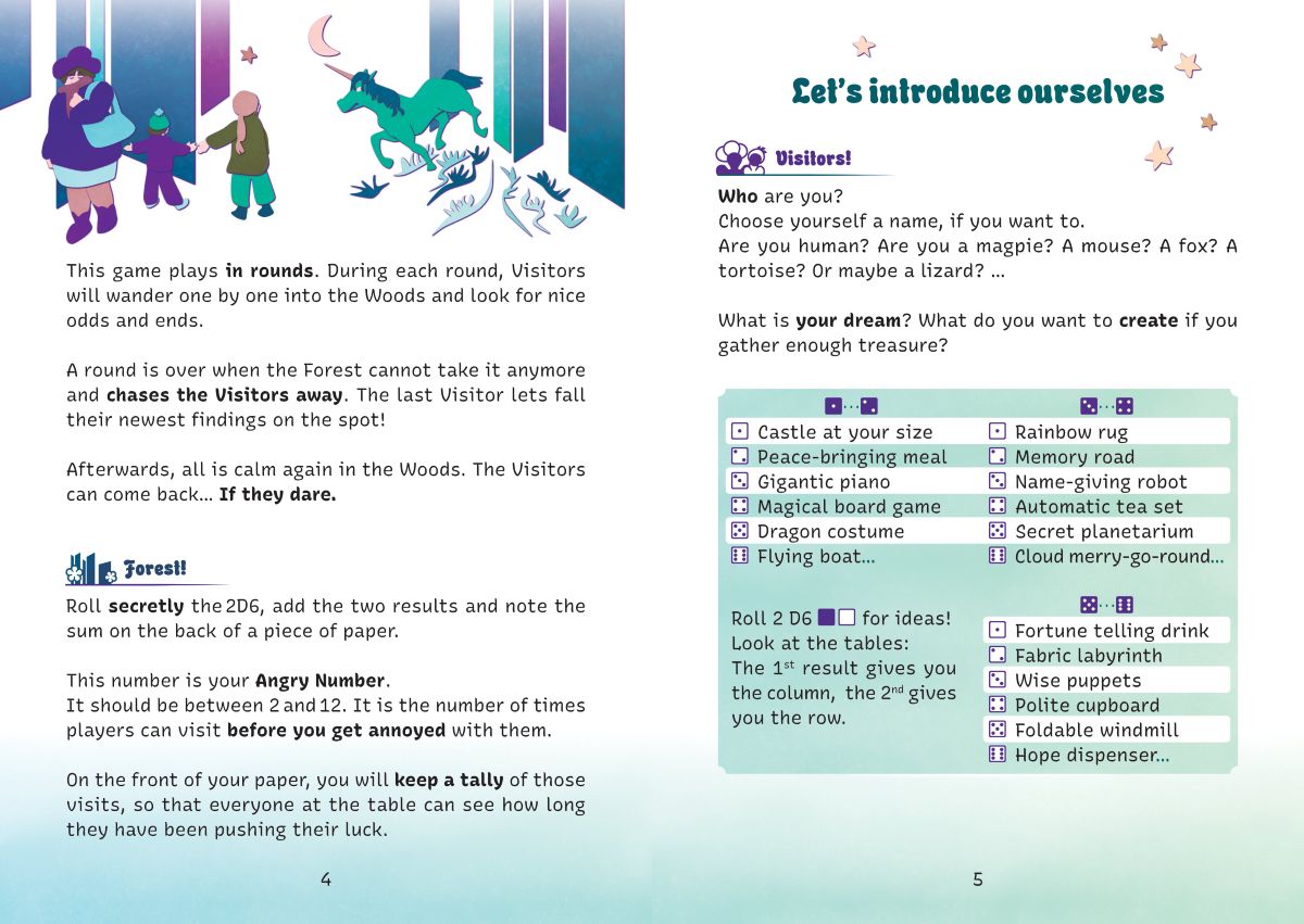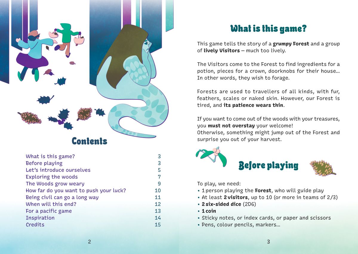 Whimsical content suitable for all ages: Only as spooky as your players want it to be. Younger and older students can play together, chosing to either draw or write about the items they discover in the woods. Light push-your-luck and negotiation aspects.
