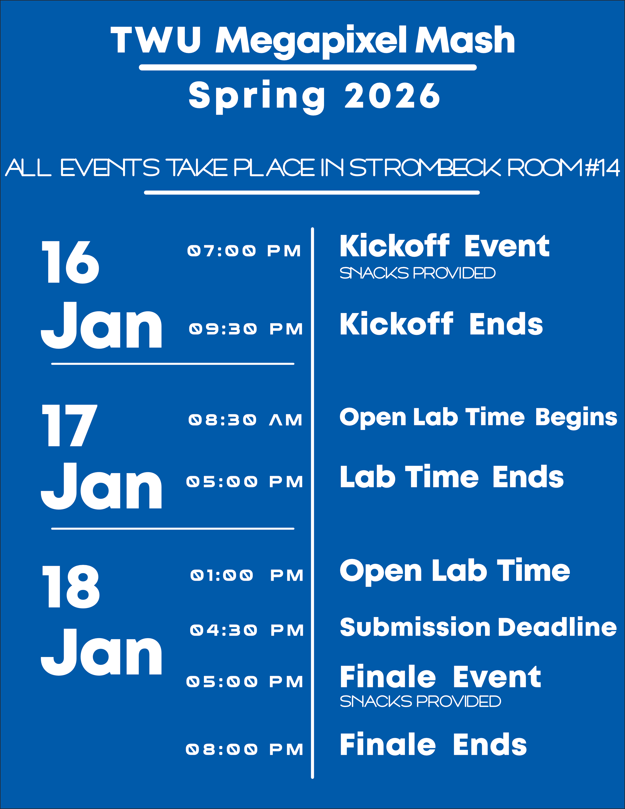 This is a Game Jam for students at Trinity Western University--all students are welcome. The Jam will be held over the weekend of January 16-18 (starting Friday night at 7:00 pm). Teams have until Sunday night to complete their game before it is adjudicated by Game Development Faculty.
