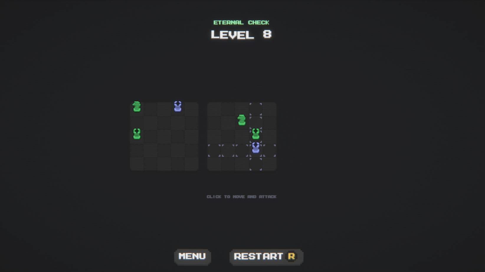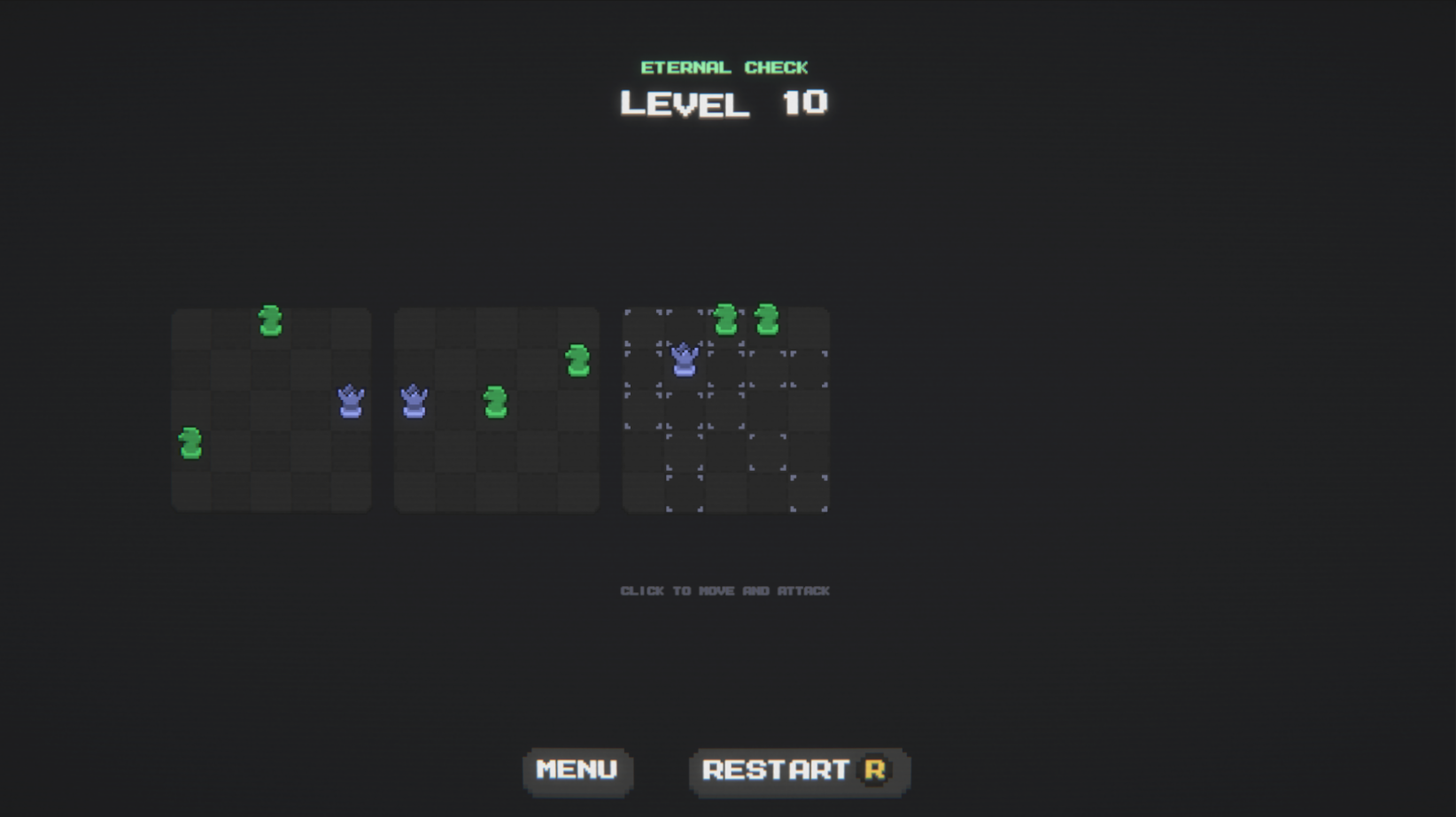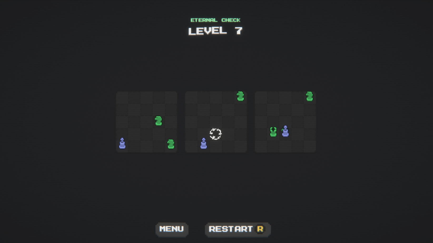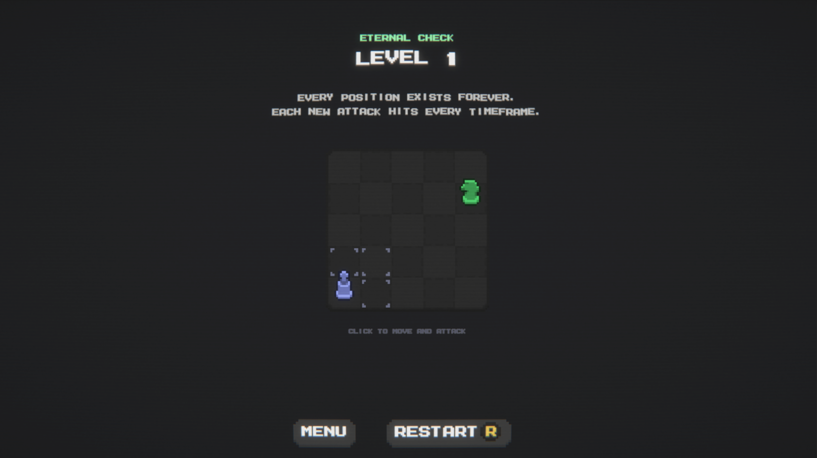 Superb game. And it looks absolutely amazing. I enjoyed playing every moment of it. Interesting twist on chess and time. The levels were well planned and made me think of all possibilities and variations. I wish there were some flags/markers we can put on the boards (or auto-marked) to keep track of past pieces making it easier for amateur chess players. But this can totally be released on all platforms as a full game with more levels and some extra features (boosts, power ups, perks, etc.)