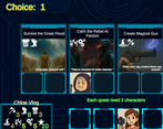 Pretty interesting game. I got to the 'end'? I think? lol Loved the art and music, very well done. There is a bug when you move characters from one quest to the next, seems to be related to the enlargement/resizing, Well done!