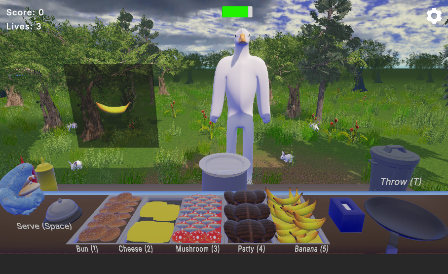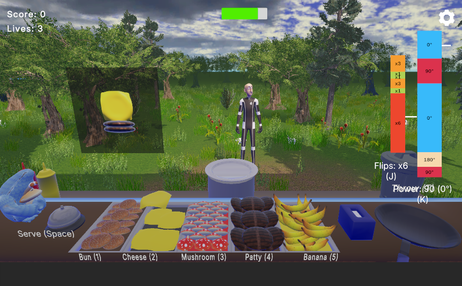 Fun idea--reminds me of how SpongeBob might be making Krabby Patty. :D It took me a while to figure out everything, though, especially what a "meter" is. Still not sure what the flip meter does. Felt a little overwhelmed at the beginning, with so many things to handle all at once within a short time limit. People who like multi-tasking may like it. But perhaps starting with one thing at a time and then progressing to more. For example, starting with just selecting an item and serve without a timer, but report how long it takes for the player to make one, award stars/badges if they take less time to make one; then progress to selecting an item and flip, then serve; and so forth, … and then add timer.