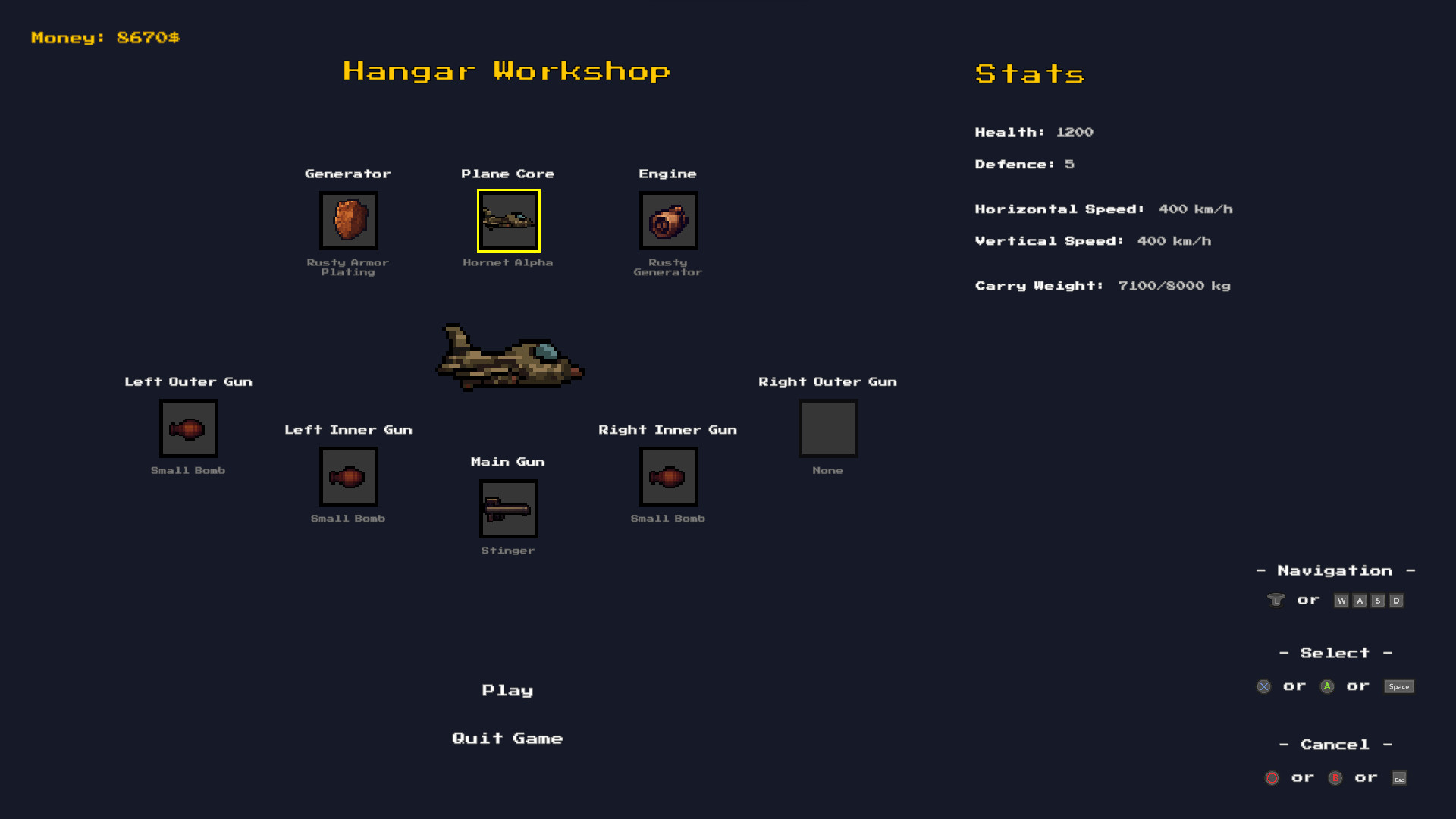 That's a really nice little game and definitely brings back SNES memories! If you really made all of this in 2 days - wow! That's incredible - I mean, not just the gameplay, but all the upgrade/hangar stuff - that's a lot of work! Nice job!