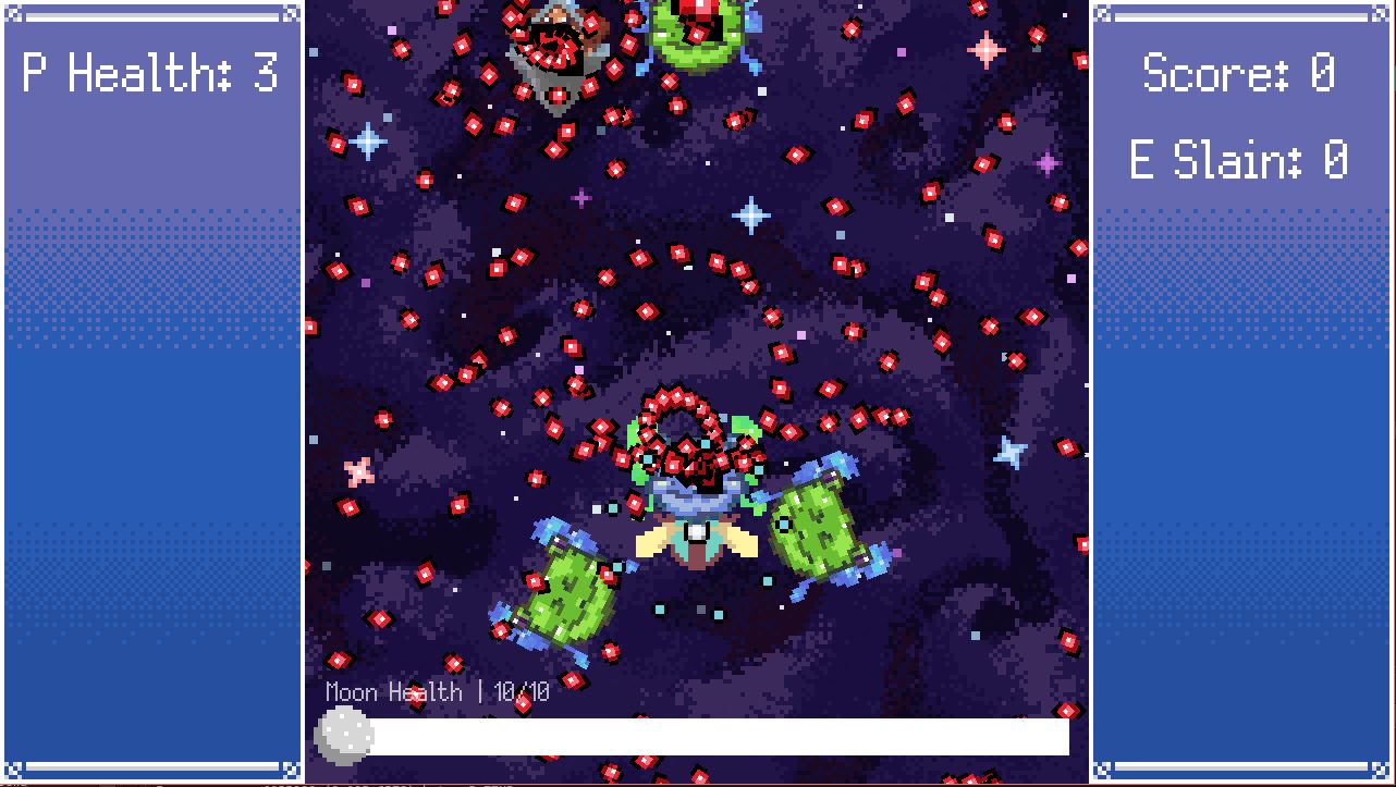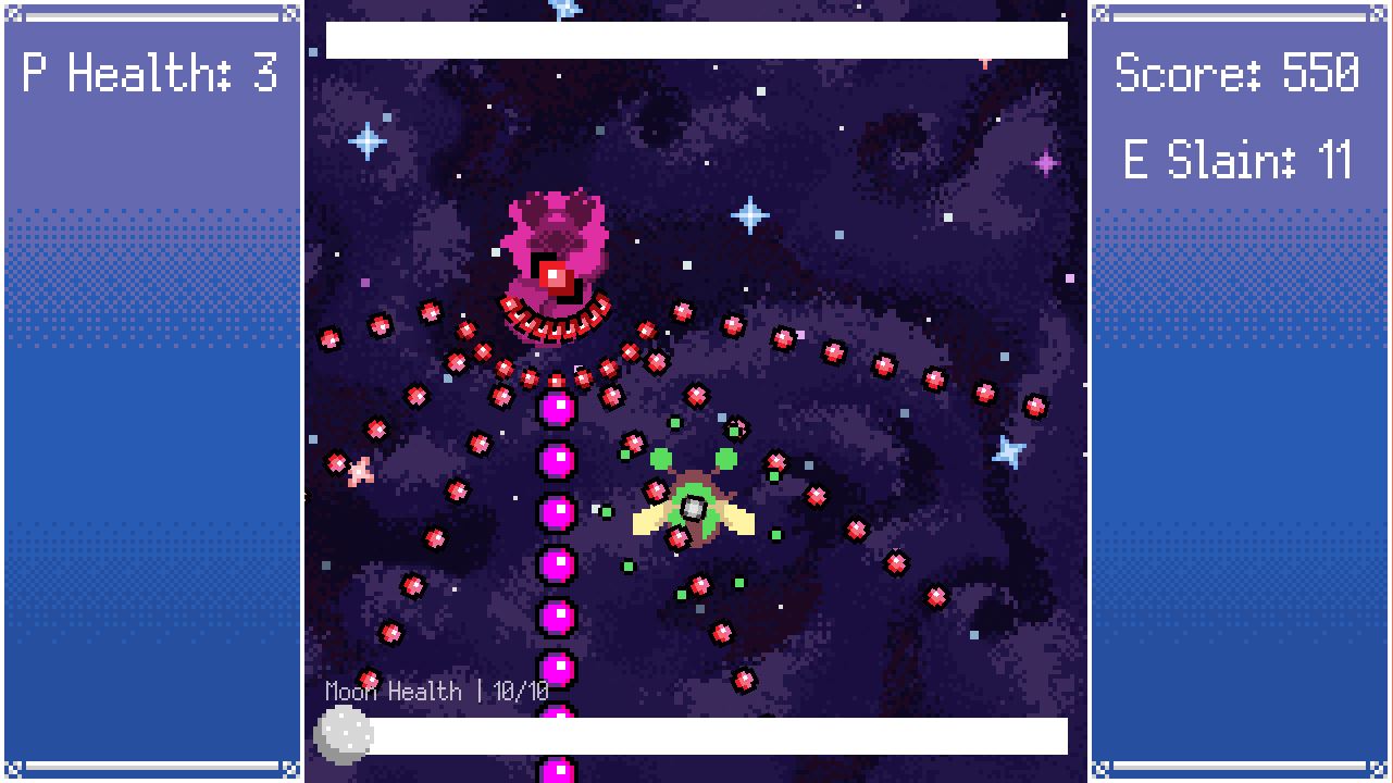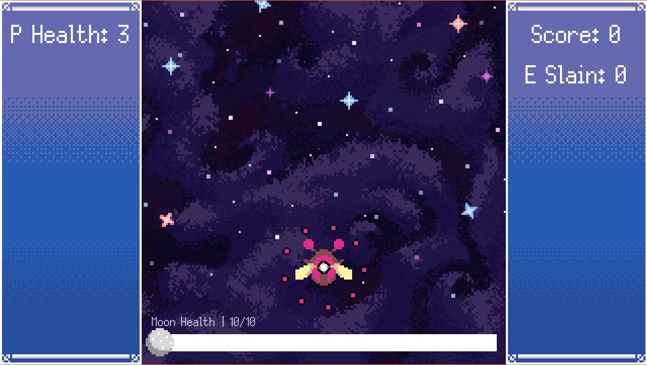 A 2D cute-em-up. Defend your moon against an alien invasion, but you can only deal damage to matching color enemies!