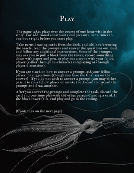 I've read several Wretched and Alone games, but this is the first I actually played. I went through all but one of the cards in my deck, wondering all the time how long my curator could put up with the strain of the artifact's psychological effects. Just long enough to give up and let the monster loose on the world it turns out (oops). The block tower is a great tool-I loved feeling the tension of a shaky pull and converting that into the narrative tension of narrowly holding onto sanity. The prompts were evocative and made it easy for me to build a horror story with some aesthetic touchstones based on my artifact. I was glad the rules specifically encouraged an audio log-I may have gone with a journal on my own, but I found in recording from sparse written notes I came up with some great ideas that I might have missed out on if not spurred on by the sound of my own voice. I'll definitely recommend this game to others!