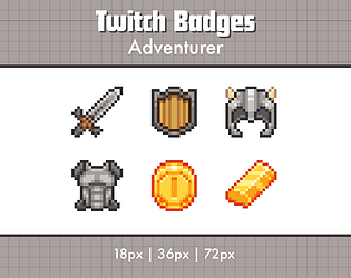 A set of 6 pixel art sub badges for Twitch streamers, adventurer themed.