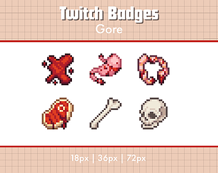 A set of 6 pixel art sub badges for Twitch streamers, gore themed.