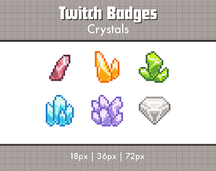 A set of 6 pixel art sub badges for Twitch streamers, crystal themed.