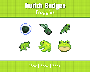 A set of 6 pixel art sub badges for Twitch streamers, frog themed.